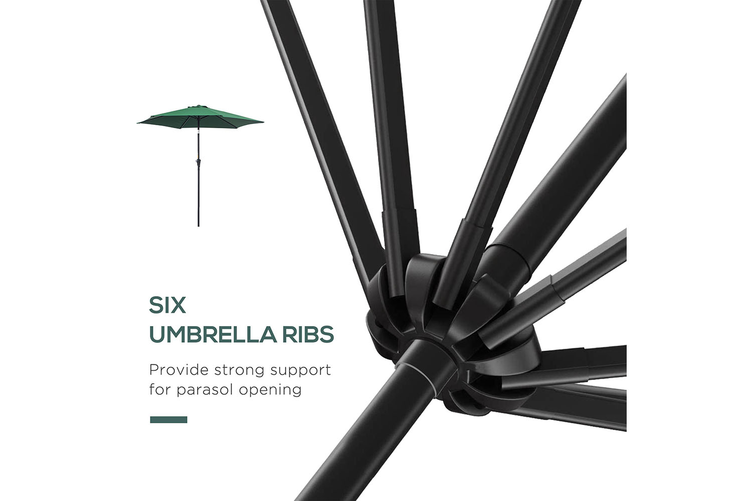 - Powder coated aluminum pole with 6 metal ribs supporting the umbrella