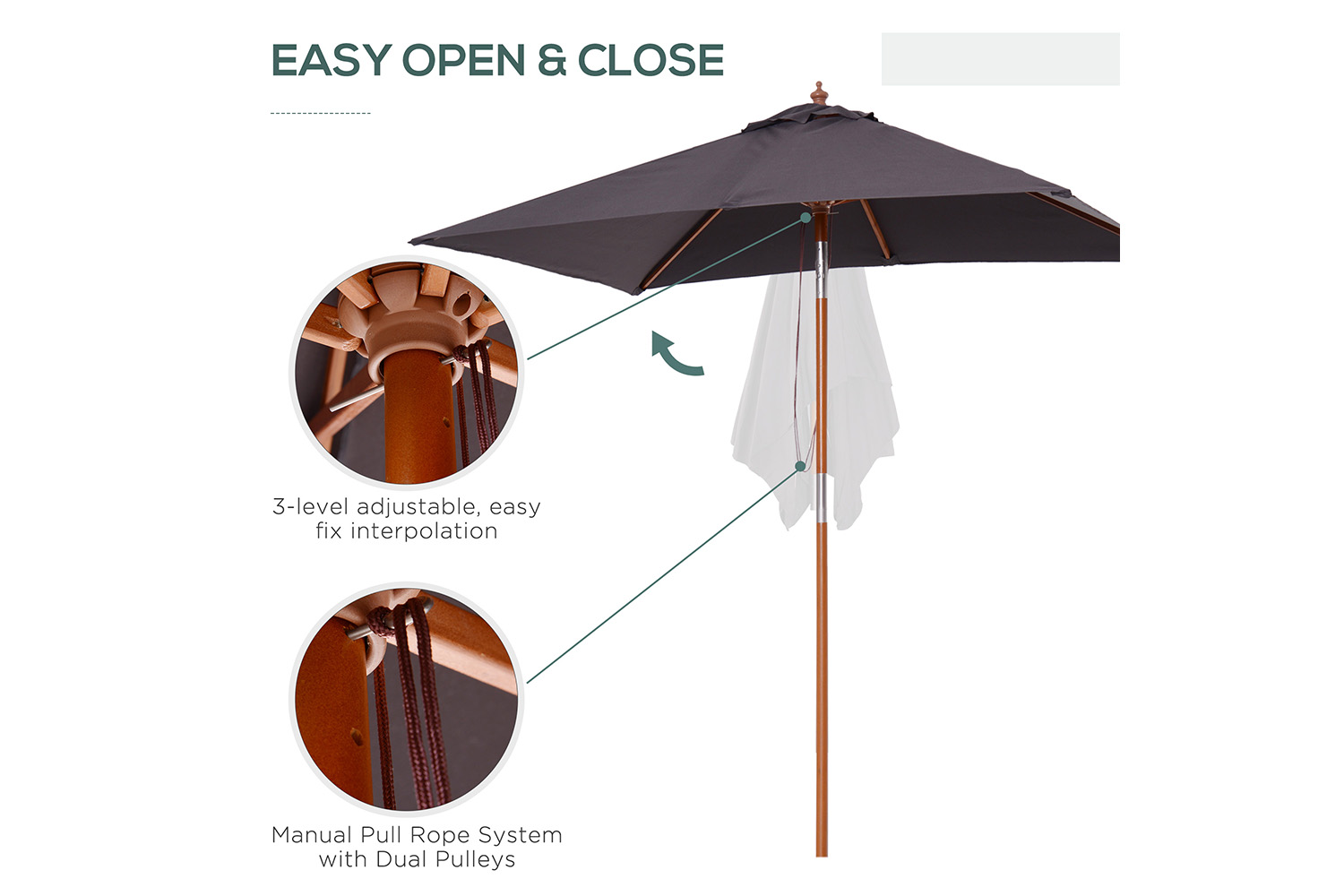 - Pull rope with double pulley for easy opening and closing