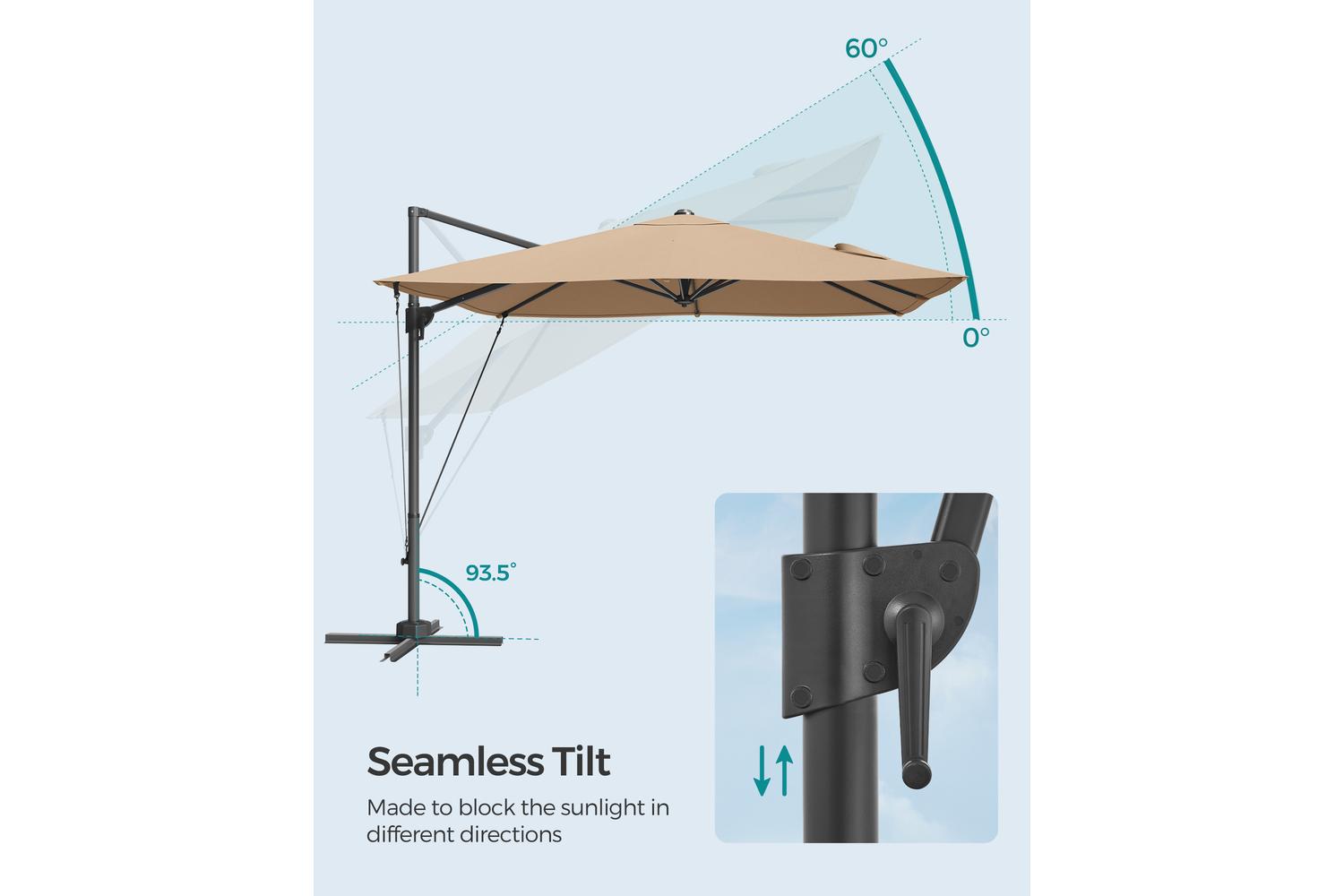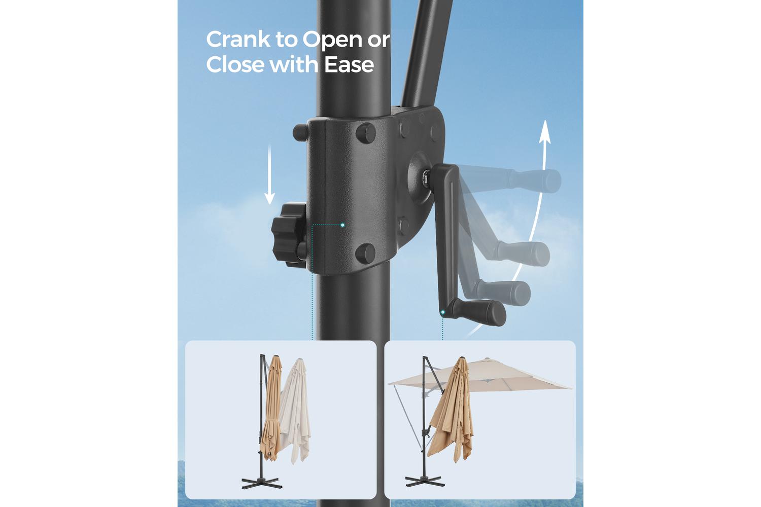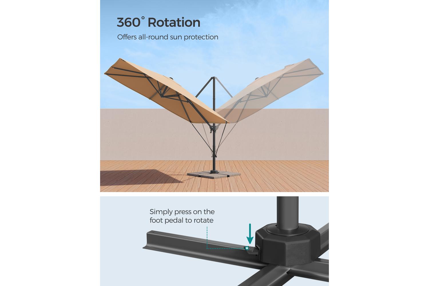 Enjoy complete control over your shade with the innovative 360° rotation and smooth tilt mechanism. With a simple press of the foot pedal, you can rotate the umbrella to follow the sun throughout the day. The easy tilt function allows you to adjust the canopy between 0 and 60°, ensuring maximum comfort and protection at any time. Opening and closing the umbrella is a breeze thanks to the user-friendly crank system, so you can spend more time relaxing and less time setting up.