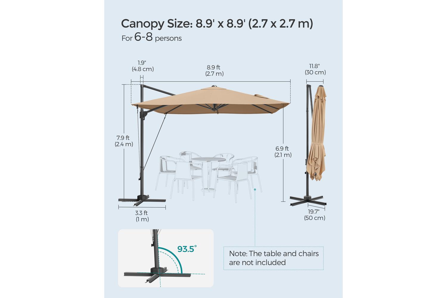 - Generous 270 x 270 cm shade area for 6 to 8 people