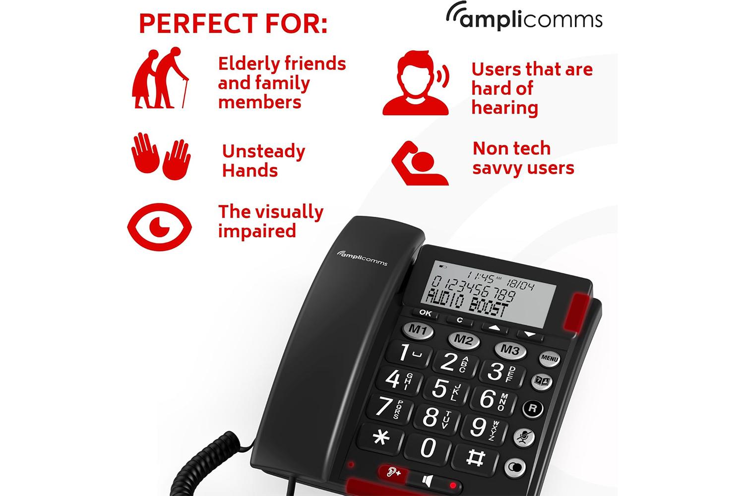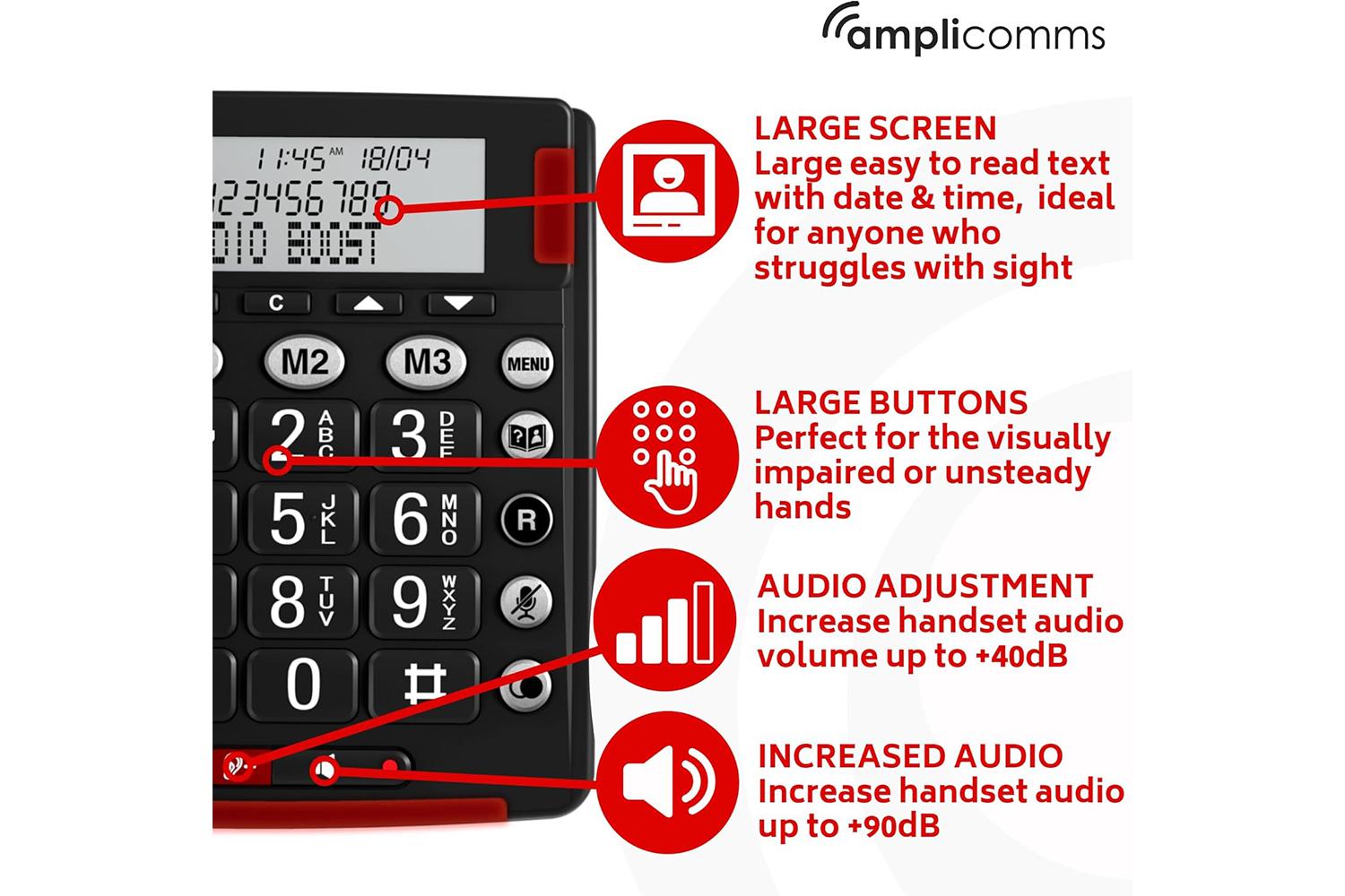 Discover a whole new communication experience with the Amplicomms Big Button Phone in elegant Black; a game-changer for individuals navigating moderate to severe hearing loss. This user-friendly, powerful home phone integrated with an audio-boost and equalizer presents a unique solution to phone-related hearing challenges, with enhanced audibility options.