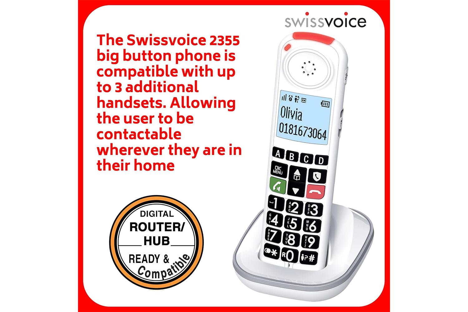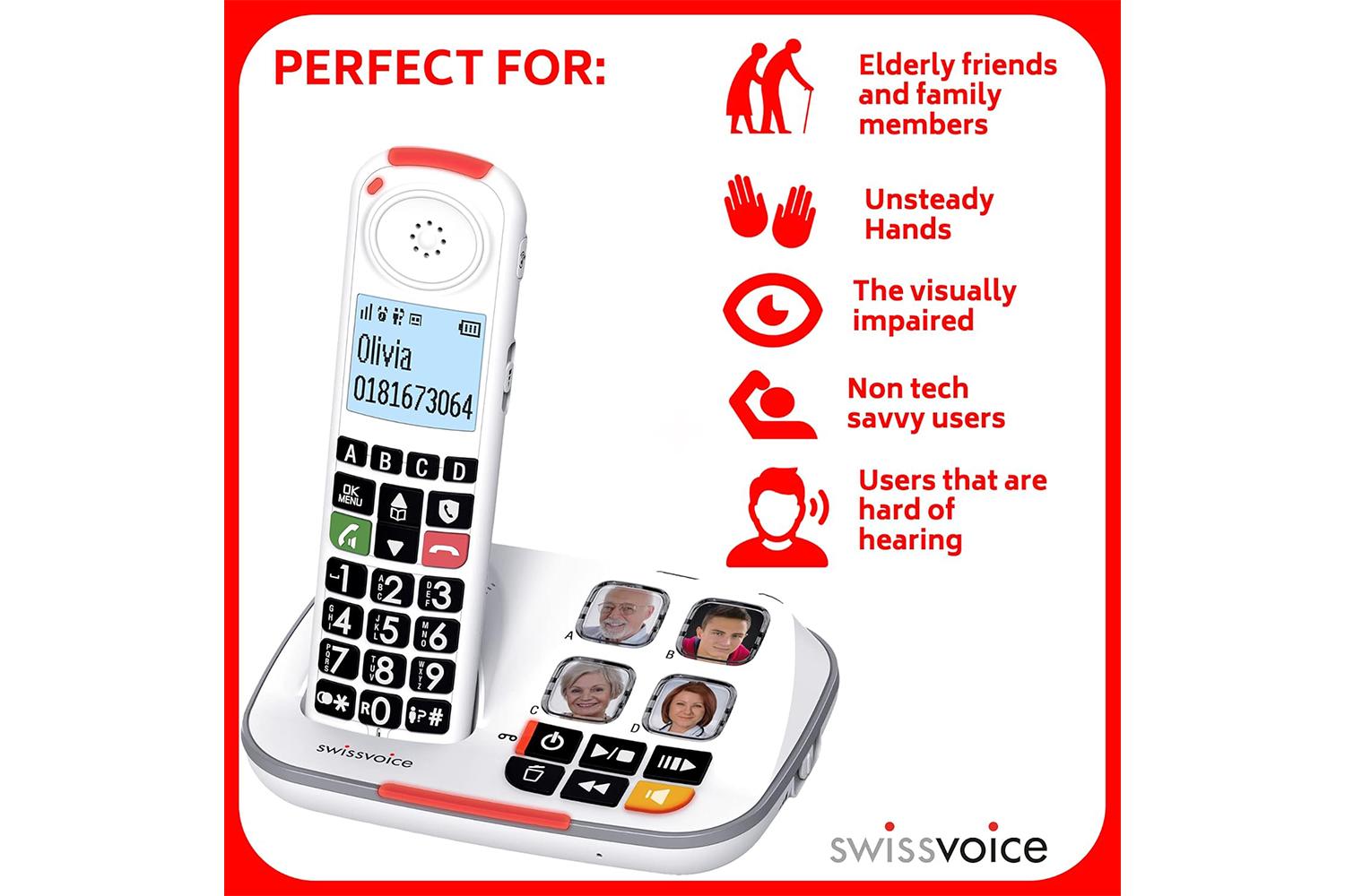 Highlighted keywords: Swissvoice, big button, cordless, phone, adjustable, accessible, audio-boost, ergonomic, memory buttons, intergenerational, communication rapport, nuisance call blackout, sight challenges, hearing preferences.