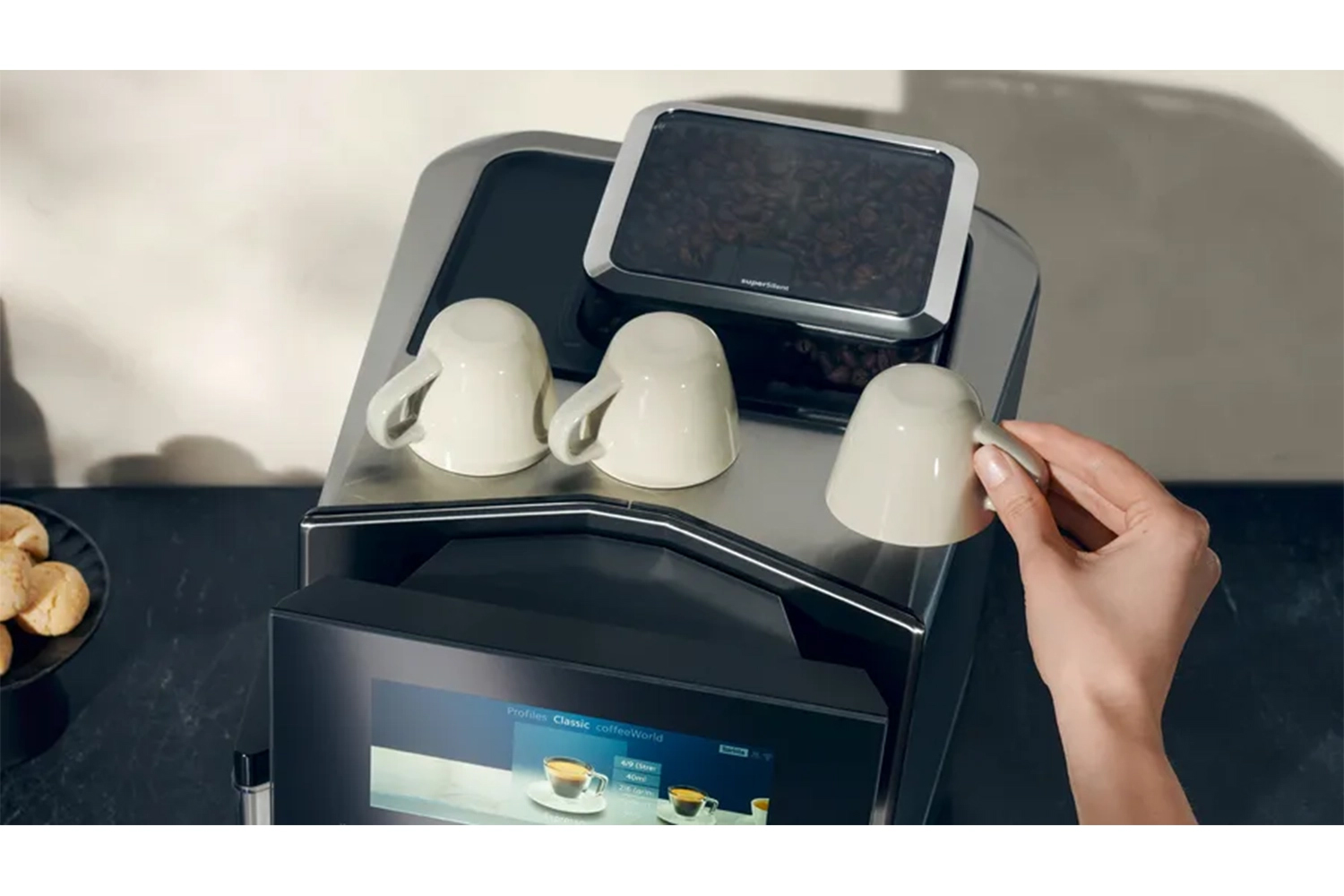The LCD screen is really easy to use and looks smart, you can customise all the coffees and there are so many preset coffees to choose from. It really does cater to all preferences. I really like how the dispenser height can be adjusted to reduce any splatter from drinks. They’ve really paid attention to detail making this.