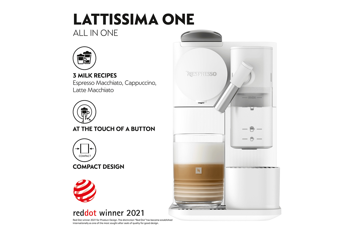 • One touch fresh milk system with a compact, dishwasher safe milk jug