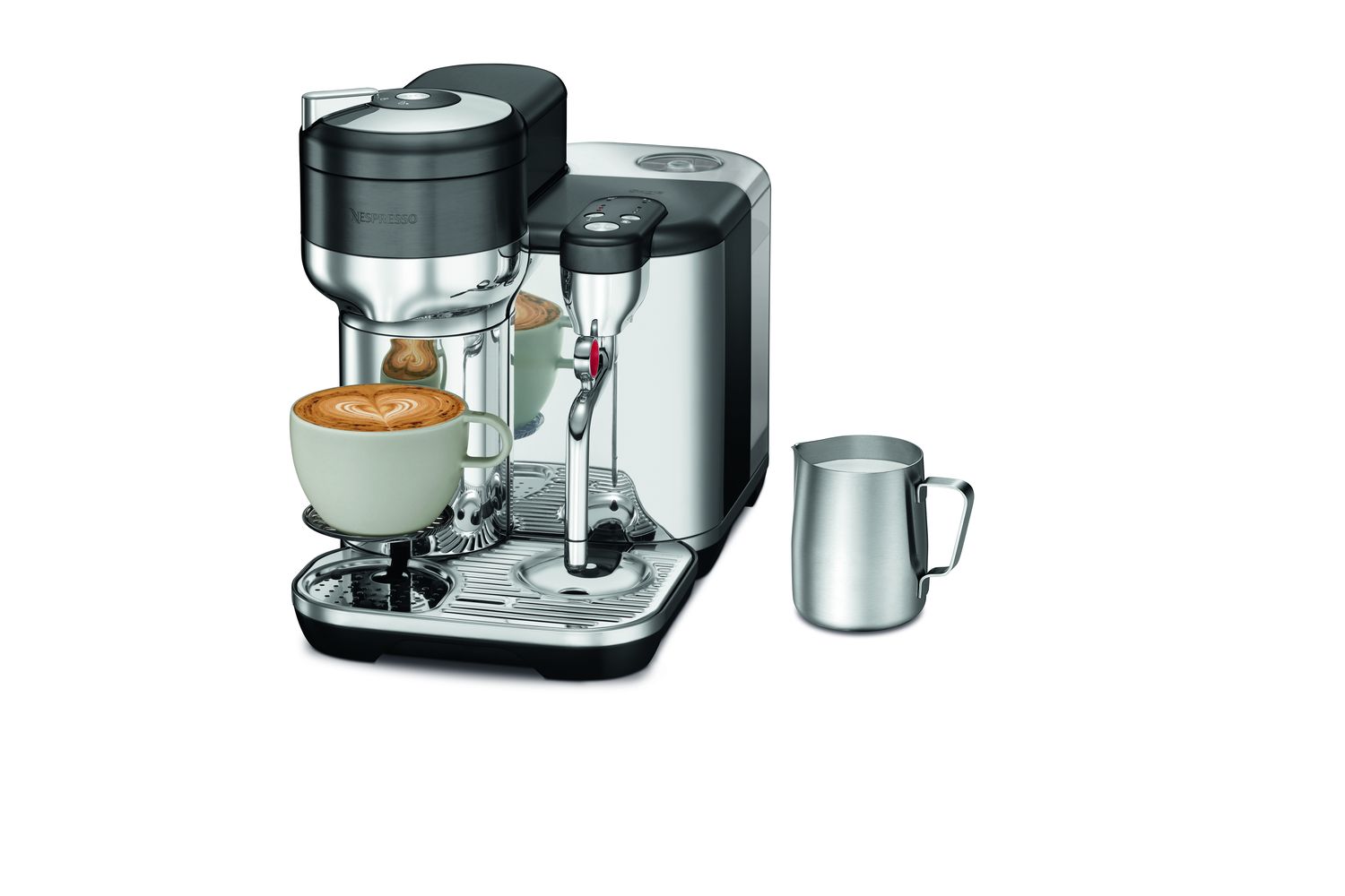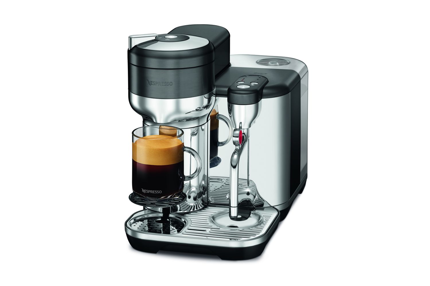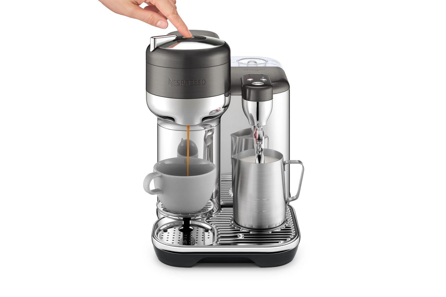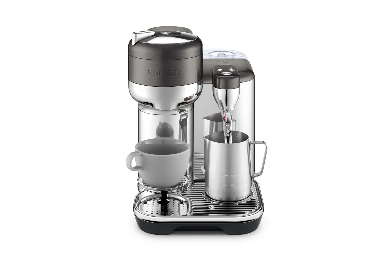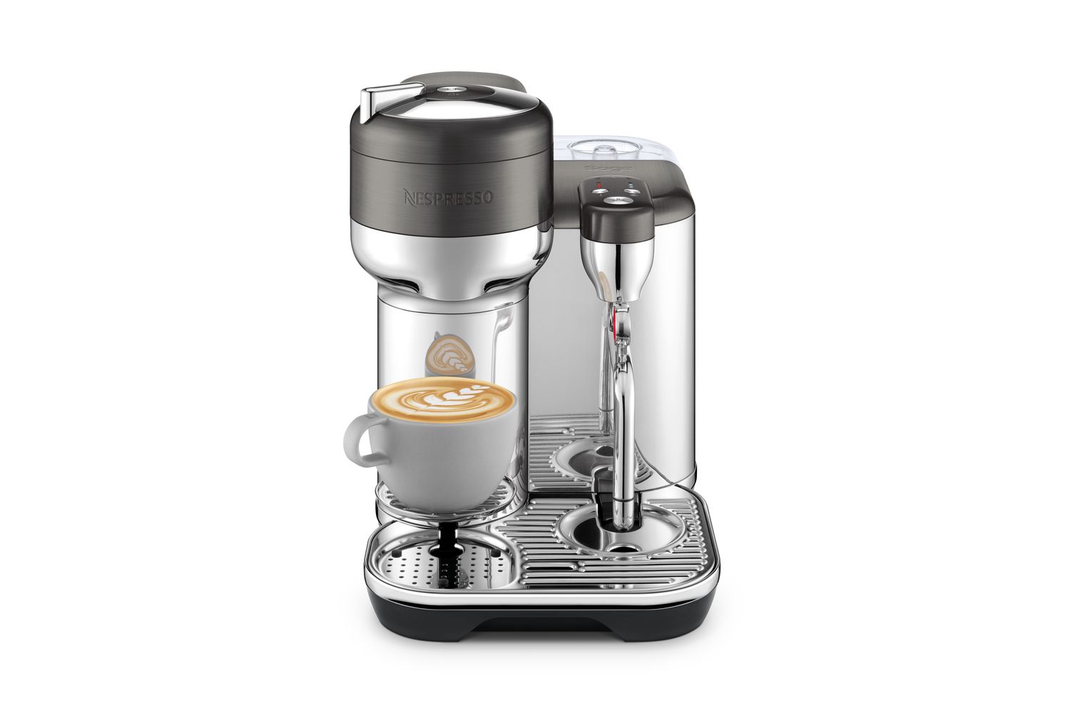 Crafted in a premium-grade, brushed and polished stainless steel, the Sage Creatista will effortlessly melt into your kitchen setting. Its novel design includes a compact drip tray that incorporates a small cup holder, perfect for smaller drinks. This removable drip tray gives room for larger containers, allowing direct brewing into your travel mug or your Nespresso carafe.