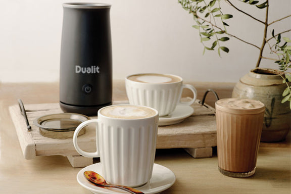 Create barista-style drinks at home in minutes with the new Dualit Handheld Milk Frother. Ideal for making flat whites, cappuccinos, lattes, mochas, milkshakes or decadent hot chocolates, without needing to visit a coffee shop. A range of unique accessories ensures perfectly texturised, frothed milk every time. The Handheld Milk Frother also has a cool touch body and non-stick rubber feet for convenient kitchen to table use.