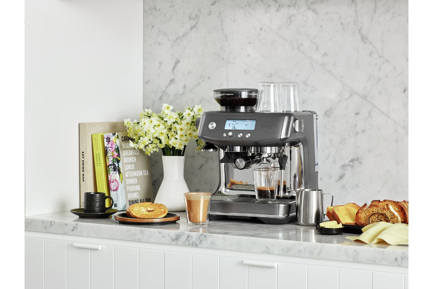 Barista quality performance with an intuitive interface that displays all the information you need to create third wave speciality coffee at home. The integrated grinder delivers the right amount of ground coffee on demand, for rich full flavour. With a ThermoJet heating system, 3 second heat up time and precise espresso extraction, you go from bean to cup faster than ever before.