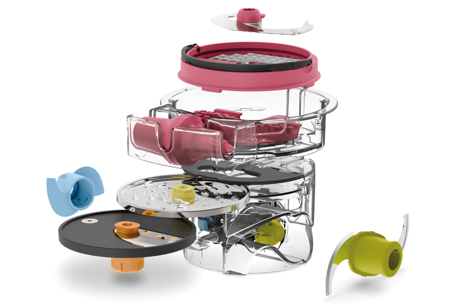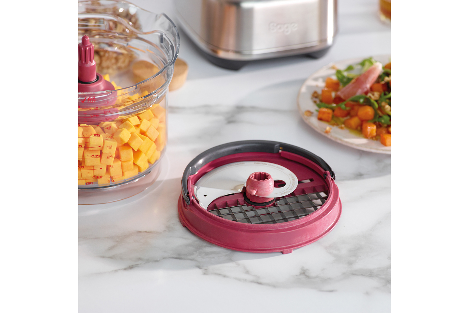 The integrated storage caddy is simple to use and houses the dicing kit, S-blade, reversible shredder, adjustable slicer and dough blade. They can be accessed independently and are neatly housed inside the bowl.