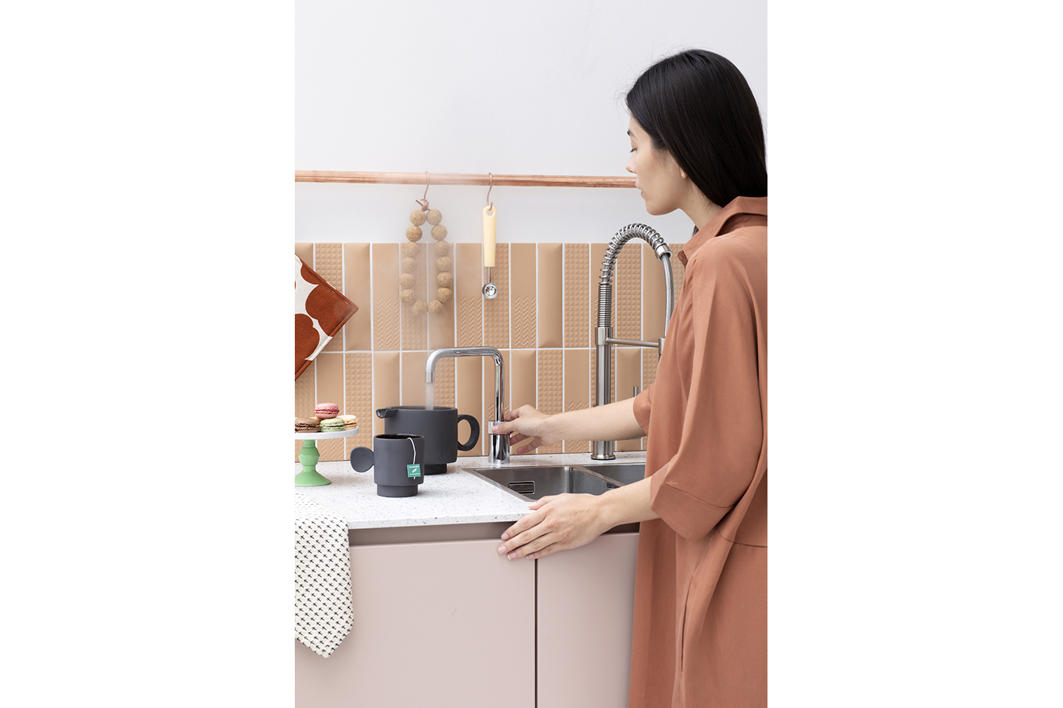 A child‑safe double push‑and‑turn control and insulated spout support confident operation; add the CUBE for chilled filtered and sparkling water.
