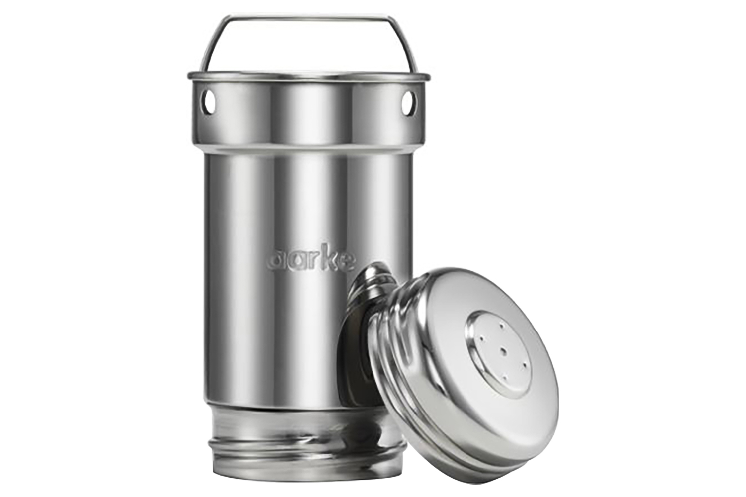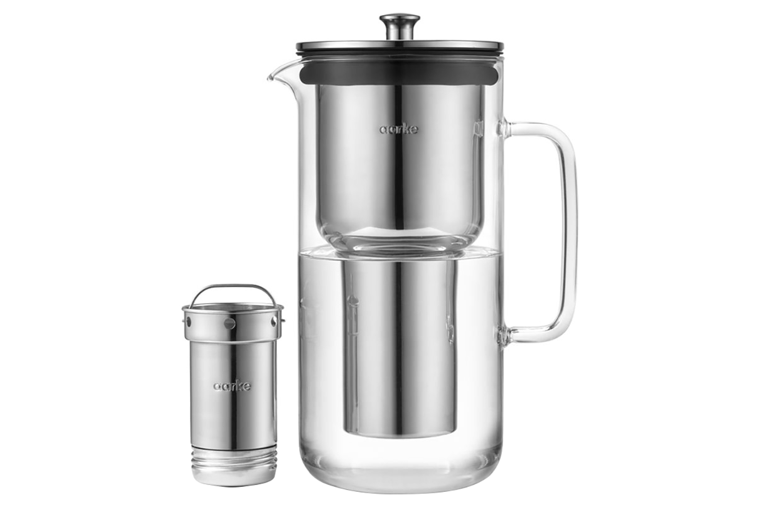 Aarke Purifier is a patented water filter pitcher in glass and stainless steel. It features a refillable steel filter cartridge and one customized refill bag of Pure filter granules. The granules are poured into the filter cartridge and make your tap water cleaner, better and more pleasurable.