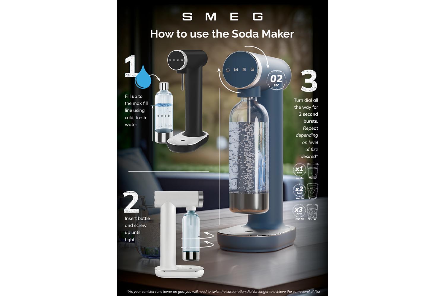 Intuitive front knob to start fizzing, seamlessly integrated into product designTritanRenew plastic bottle derived from responsible sources: durable and strong, BPA-free, and dishwasher safeManual adjustment of carbonation level, customizable to your tasteWorks with CO2 cylinder - NOT INCLUDED. Compatible with standard 400-425g/60L- 80L screw-in CO2 cylindersRequires no electricity - convenient to place or move on the kitchen countertop or bar cartProduct Features