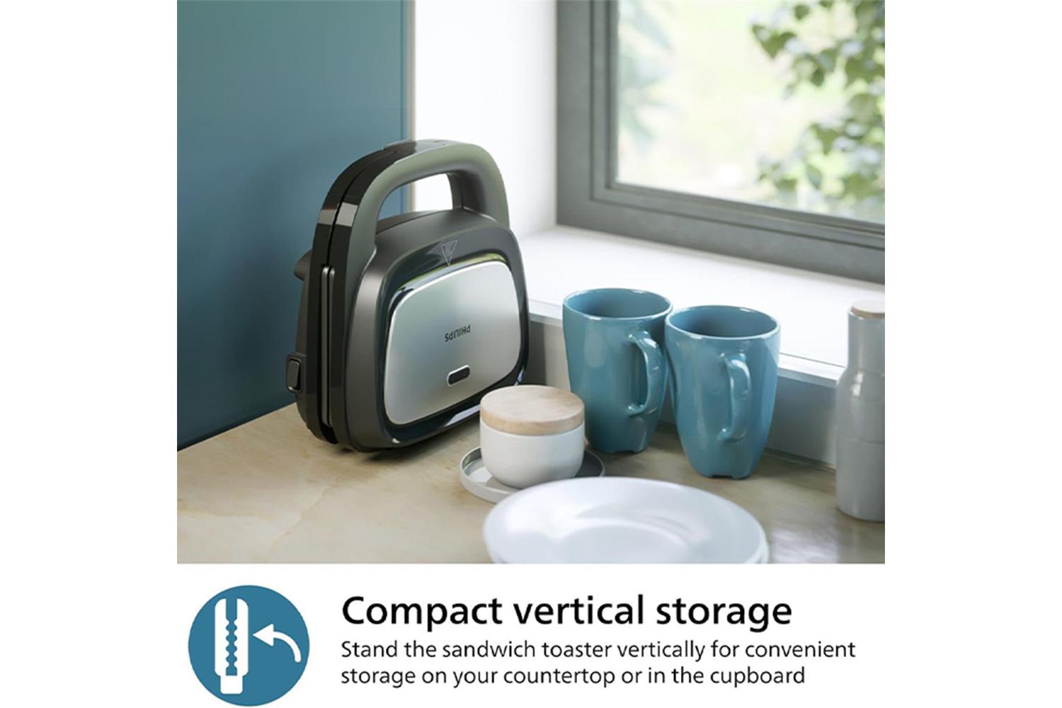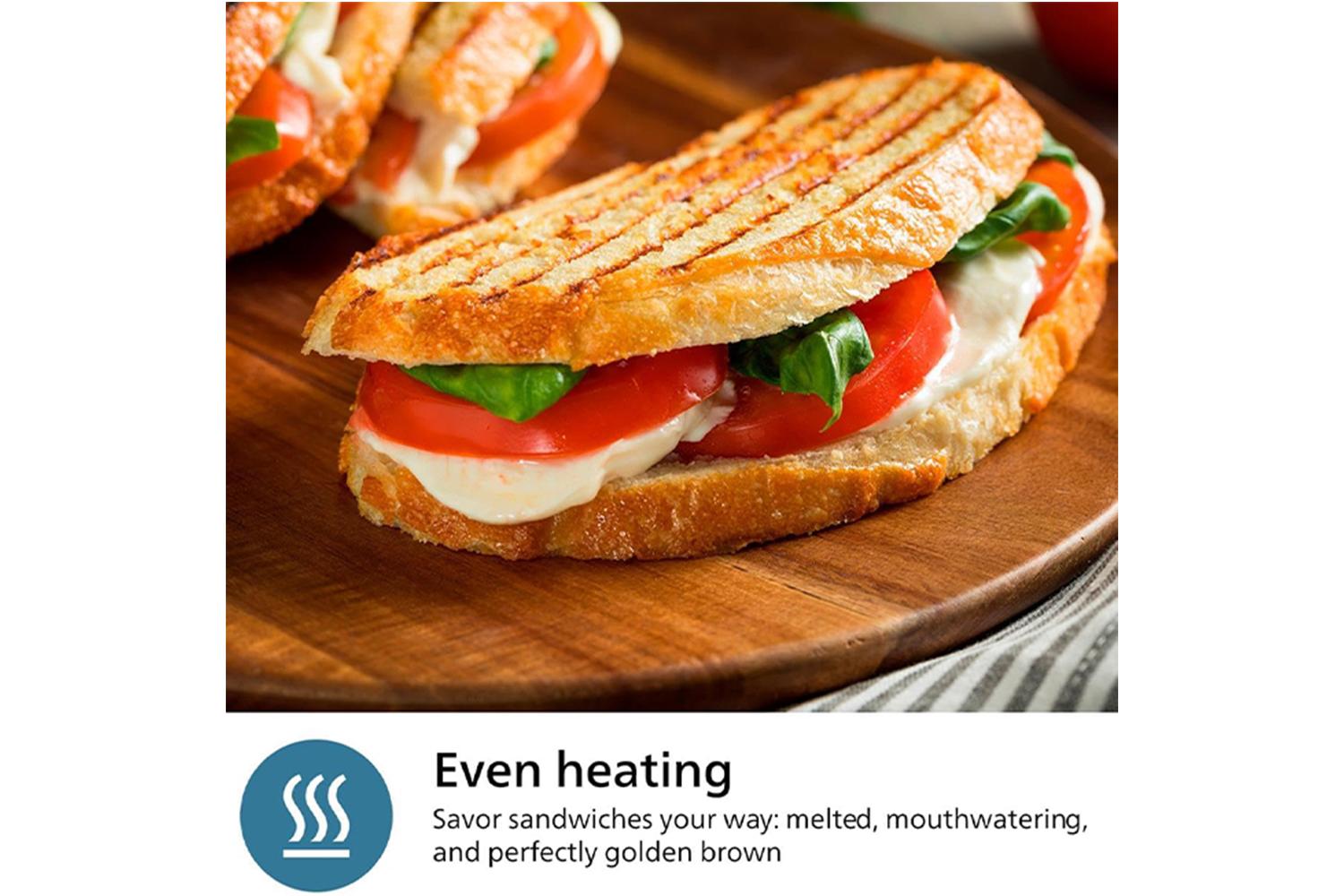 This compact, stylish and efficient all-in-one sandwich maker embodies superior technology and design. With the hefty 750W power, everything you put in is toasted to crisp, golden perfection. Reheats rapidly and offers even heating for a unified golden brown look, with the interiors melted and mouthwatering making any sandwich just exactly how everybody likes it.
