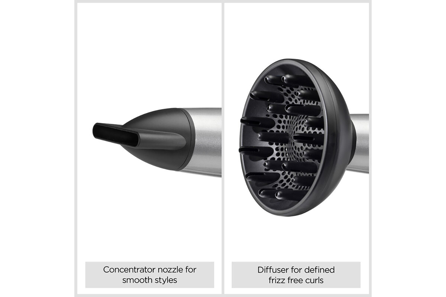 Use the slim concentrator nozzle for sleek, straight styles or attach the large diffuser to enhance curls, boost volume, and define natural texture, without the frizz.