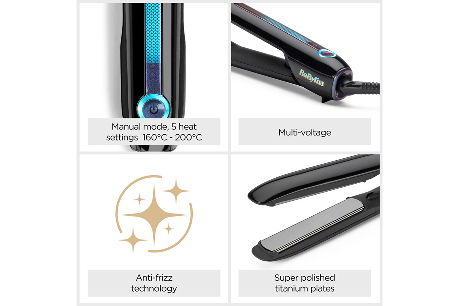 Super-polished true-titanium plates give fast even heat for single-pass straightening and lasting results.