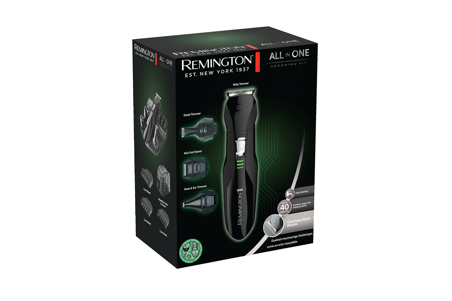 The all in one grooming kit's 30mm main trimmer has an adjustable beard and hair comb that attaches to give you 2mm-16mm length settings or choose from 3 x fixed combs (3mm-9mm). Perfect the finer details, like neatening up sideburns with the detail trimmer and trim away any unwanted hair with the linear nose and ear trimmer.