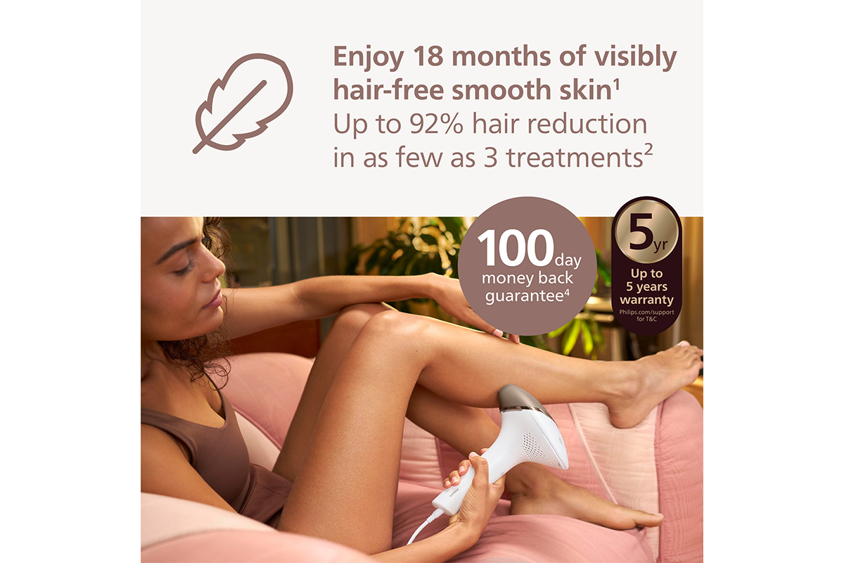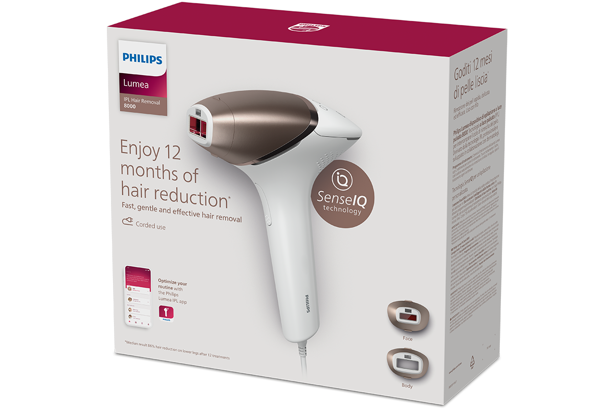 The Philips Lumea 8000 Series IPL (Intense Pulsed Light) device with SenseIQ technology has two intelligent attachments for body and face, and a Lumea IPL app for personalised hair removal treatment. Enjoy 18 months of visibly hair-free smooth skin* and up to 92% hair reduction in as few as 3 treatments**. Corded version.