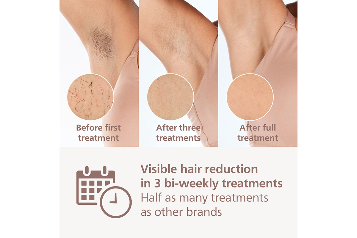 Objective studies show up to 92% hair reduction in as little as 3 treatments**. The first 4 treatments must be carried out every 2 weeks, after which you should already be able to see the desired results. To maintain your results, simply touch up every 4 weeks. After just 8 touch up treatments you can be hair-free for 6 months* To enlarge this picture, please click on the image in the image gallery at the top of this page.