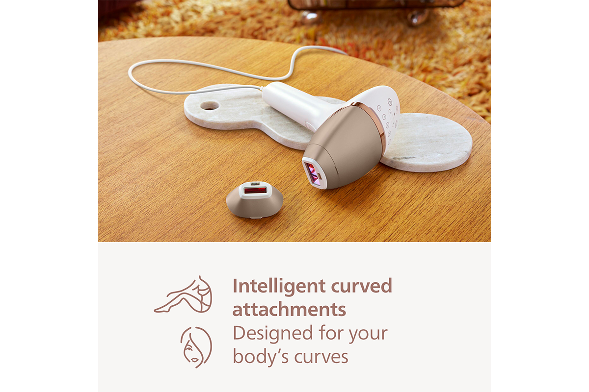 The intelligent body attachment has our largest treatment window at 4.1 cm2 so it's perfect for fast treatment of larger body areas like legs, arms and stomach. The curved-in design closely follows your body's contours for maximum skin contact. The click-on attachment adapts a tailored programme specifically for your body areas. 83% of women were satisfied with hair reduction on legs****.