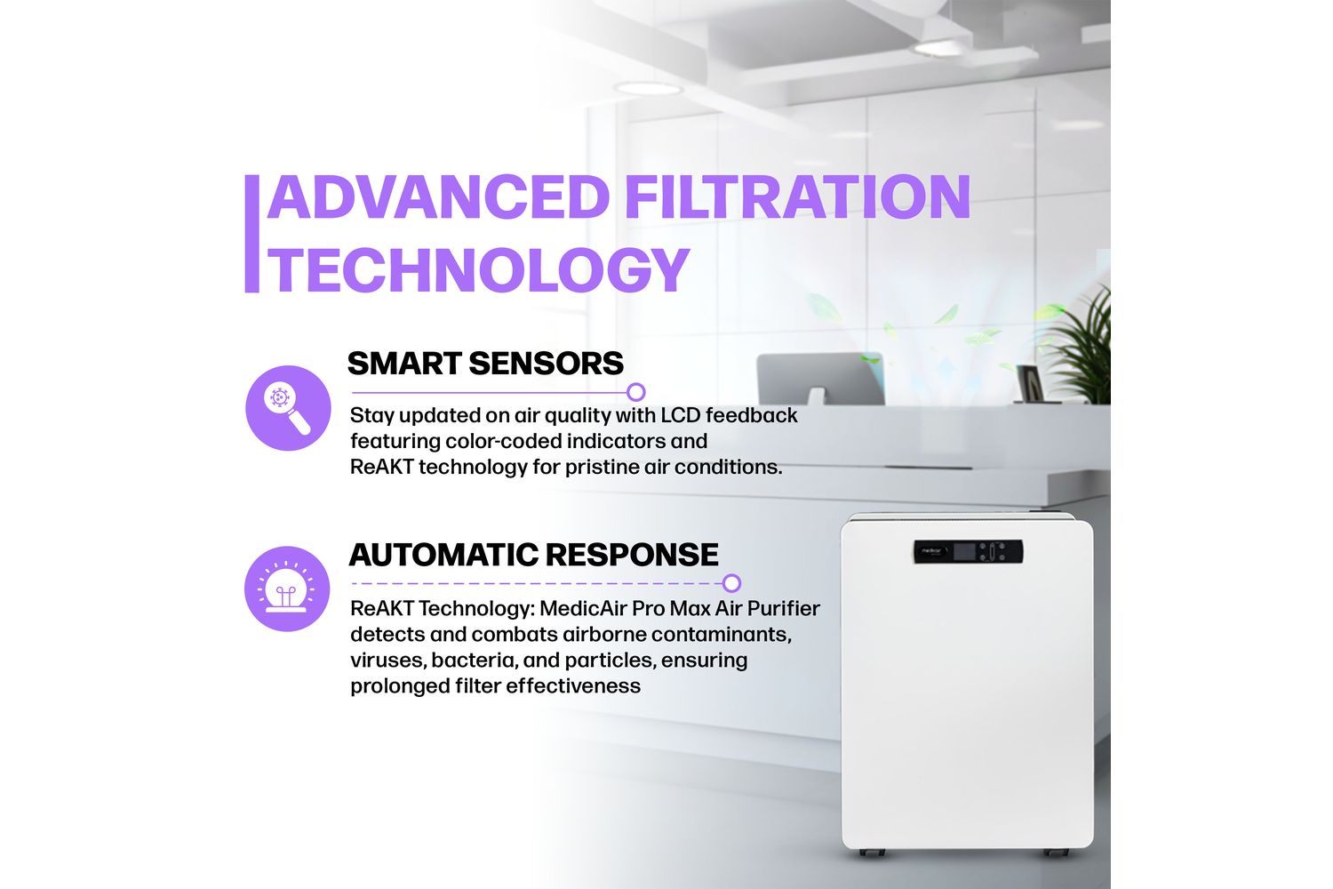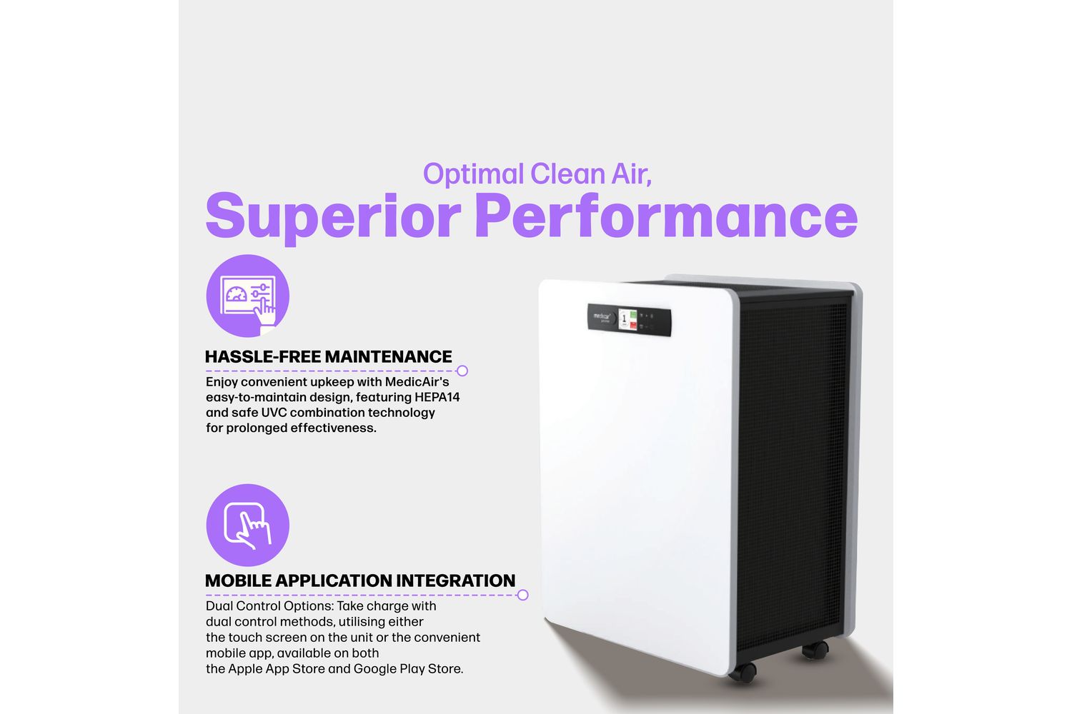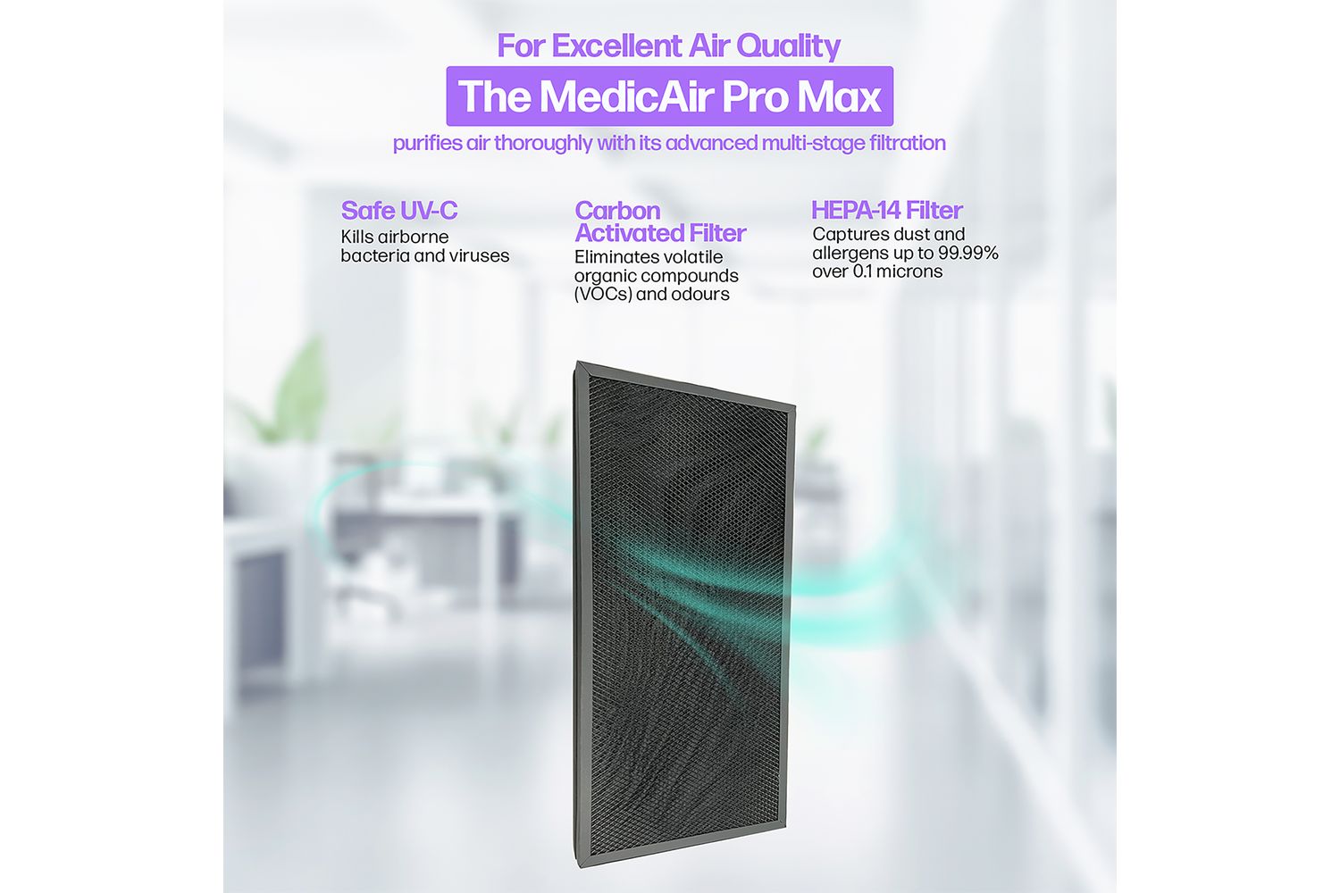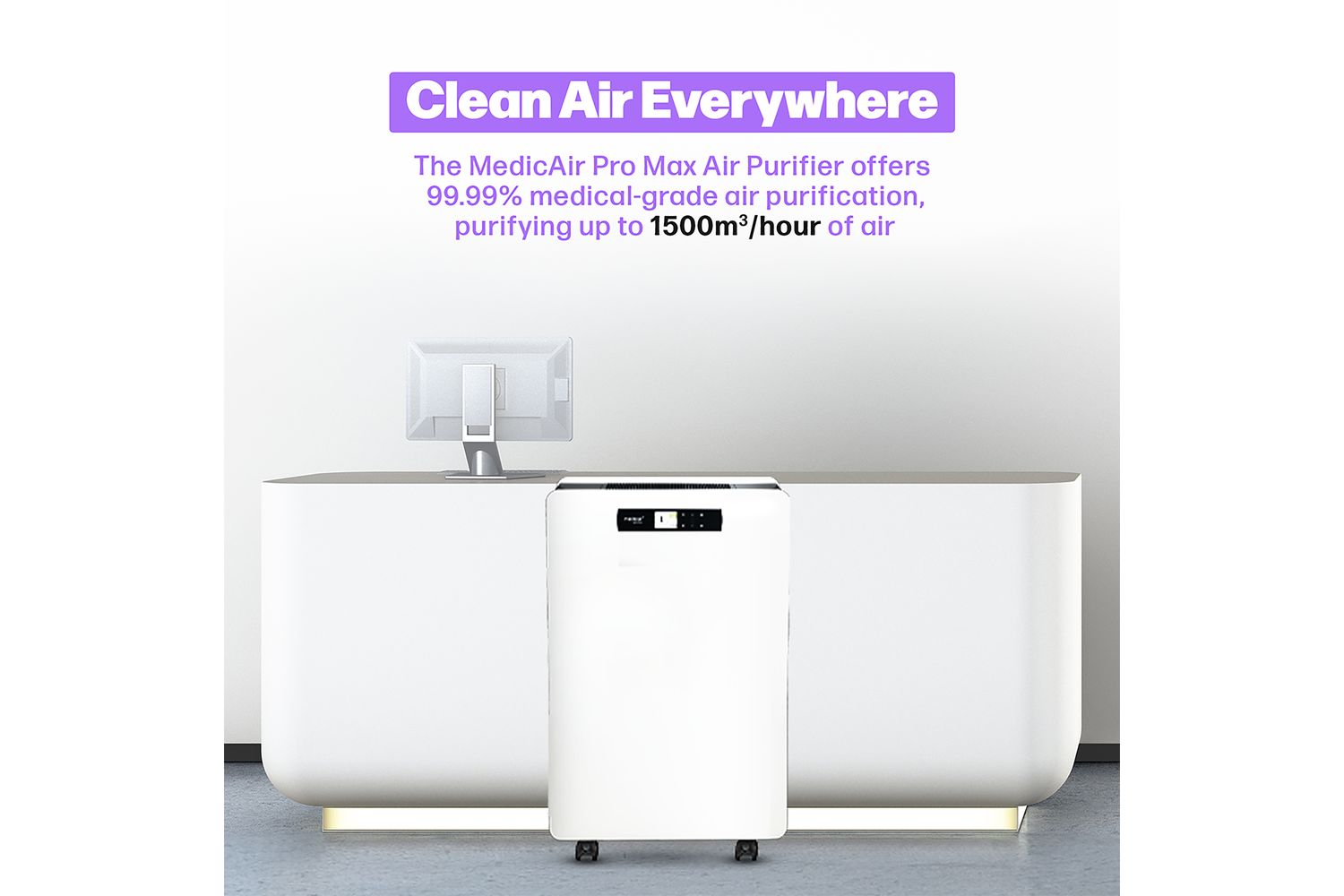 Introduce a breath of fresh air into your commercial spaces with MEDICAIR's MedicAir Pro Max, the premium choice in heating, cooling, and air treatment solutions. Trust this device that is revered by Fortune 500 companies, the NHS, and countless other healthcare facilities for unparalleled air purification. Derived from medical grade technology, this high-capacity air purifier eradicates harmful pollutants, including viruses, bacteria, allergens, and fine particles with an impressive success rate of 99.99%.