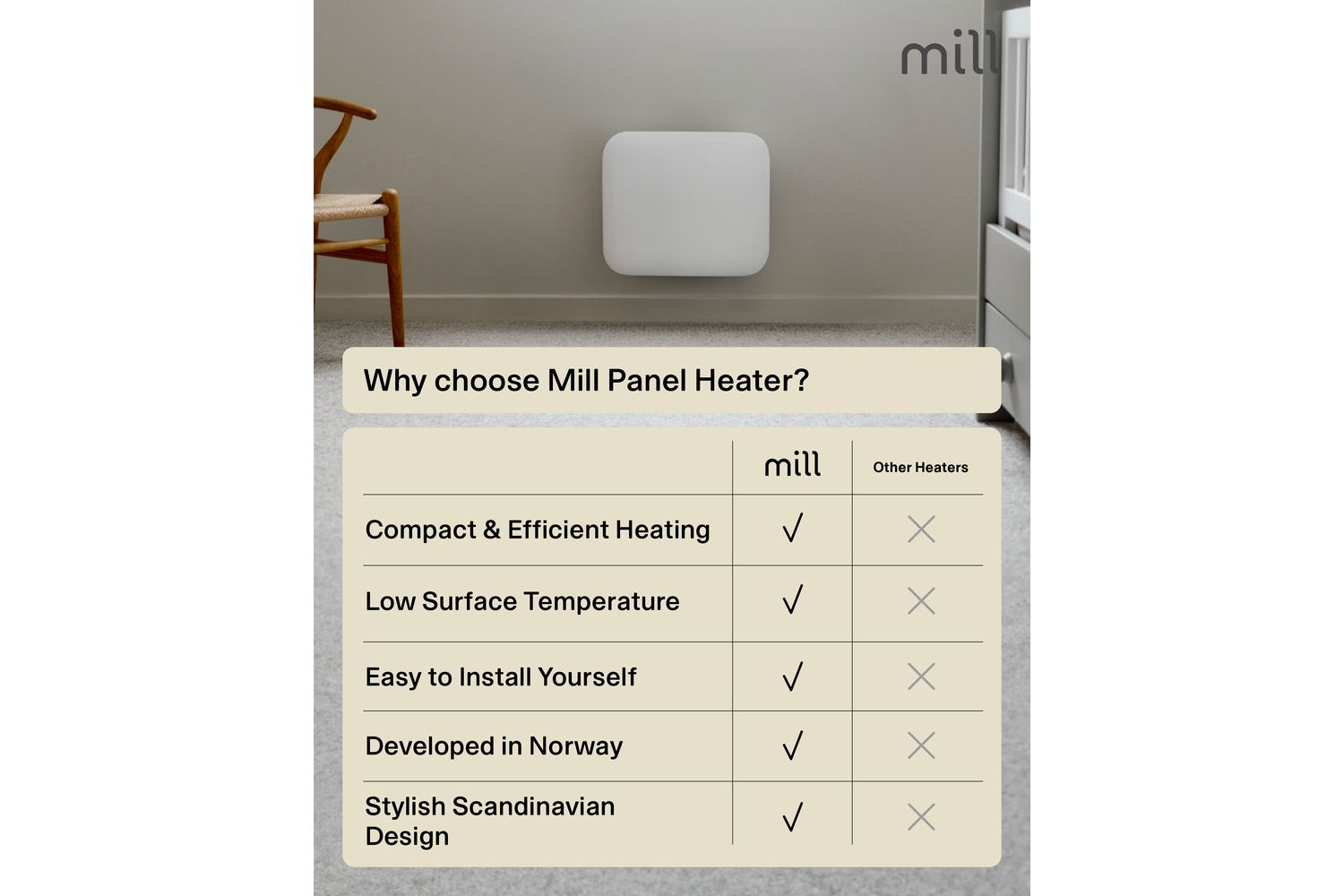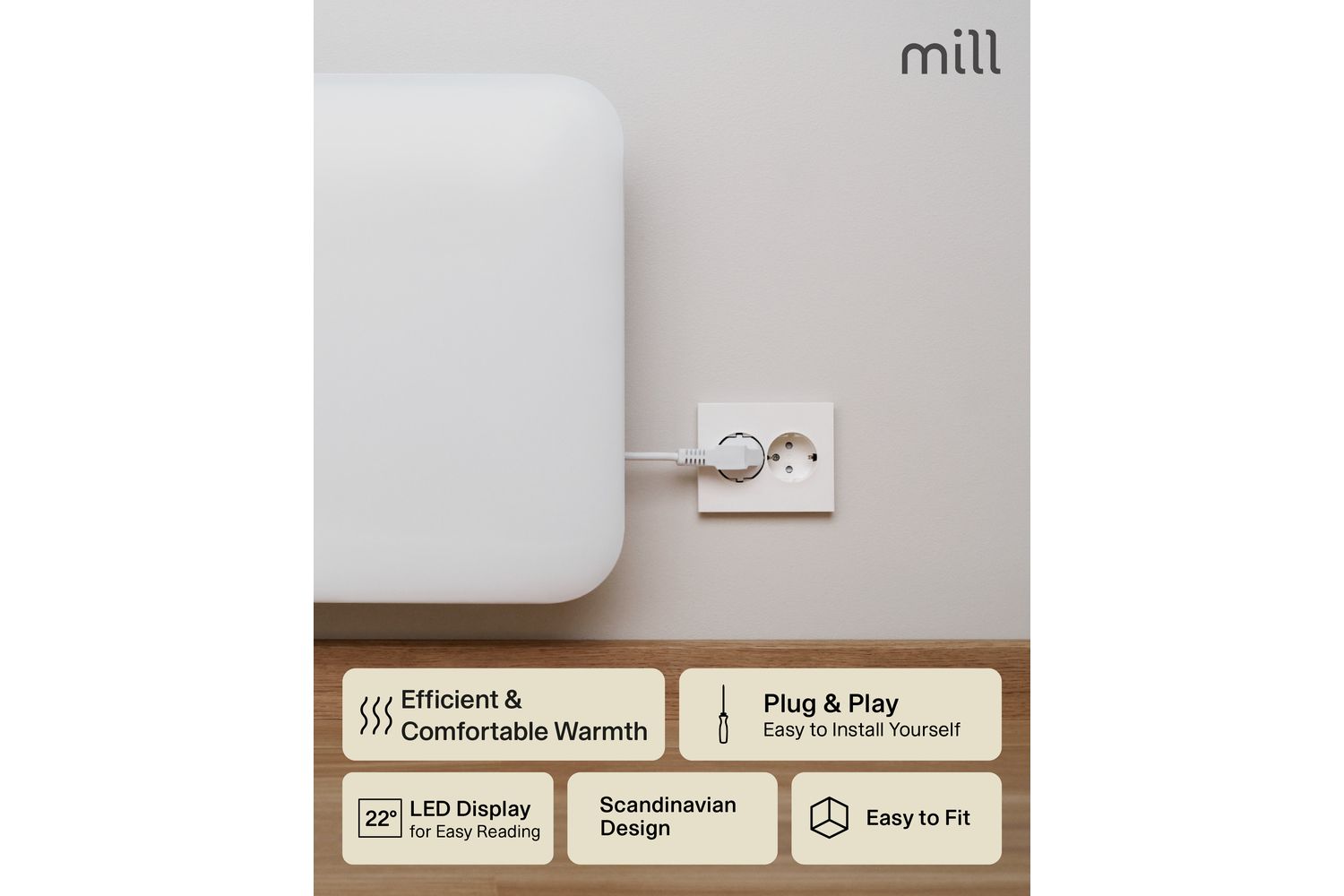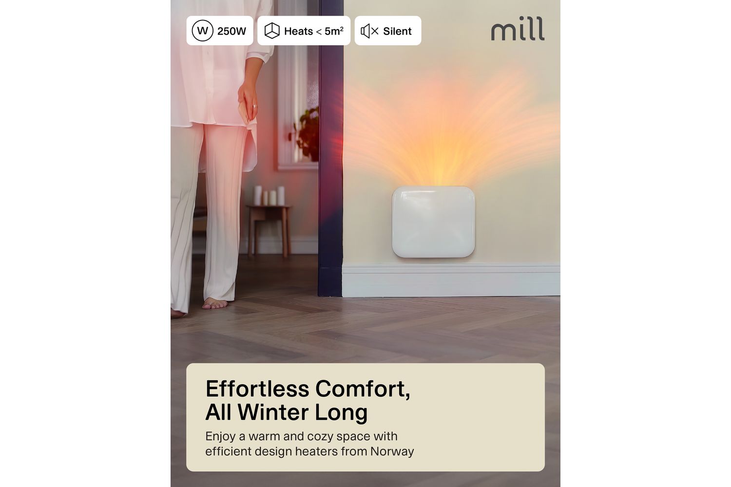Engineered in Norway, the Mill Invisible Panel Heater 250W is built for both performance and safety. The advanced X-aluminium heating element delivers fast, even heat distribution, ensuring your room reaches the perfect temperature quickly and quietly. With a low surface temperature and silent operation, this heater is safe to leave unattended, making it perfect for overnight use or busy family homes. The integrated electronic thermostat and clear LED display allow for precise temperature control, so you can enjoy effortless comfort at the touch of a button.