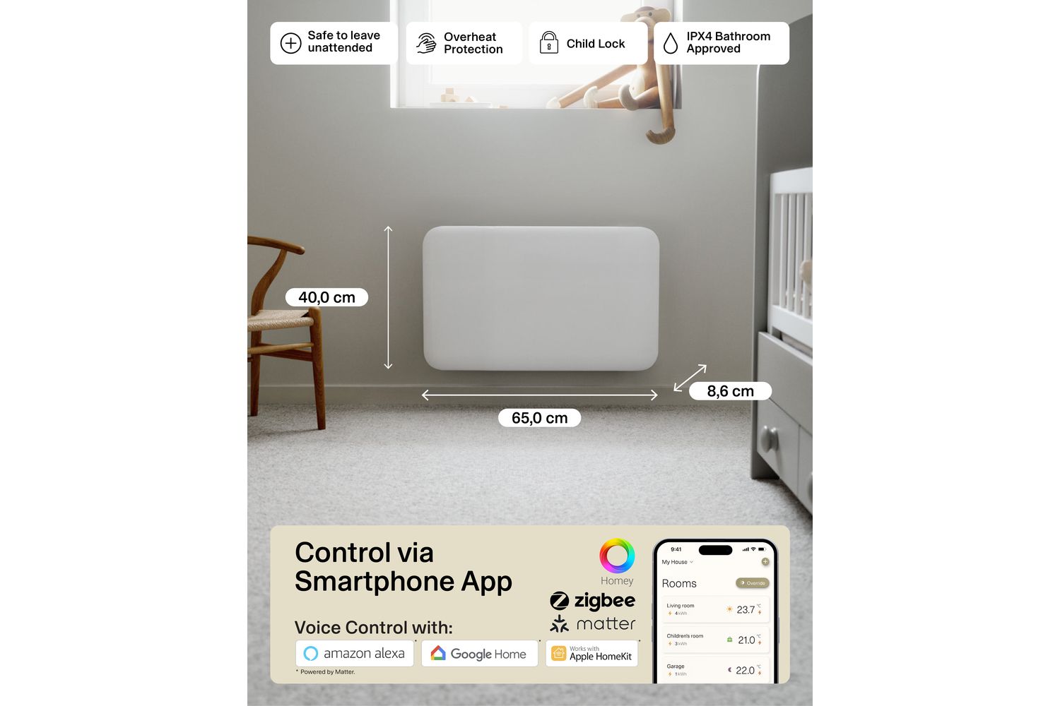 Enjoy effortless control and peace of mind with advanced smart features. The integrated WiFi and app connectivity allow you to manage your heating from anywhere, set schedules, and monitor energy usage directly from your phone. With compatibility for Matter, Zigbee 3.0, Google Home, Amazon Alexa, and Apple HomeKit, this heater fits perfectly into your smart home ecosystem, future-proofing your investment.