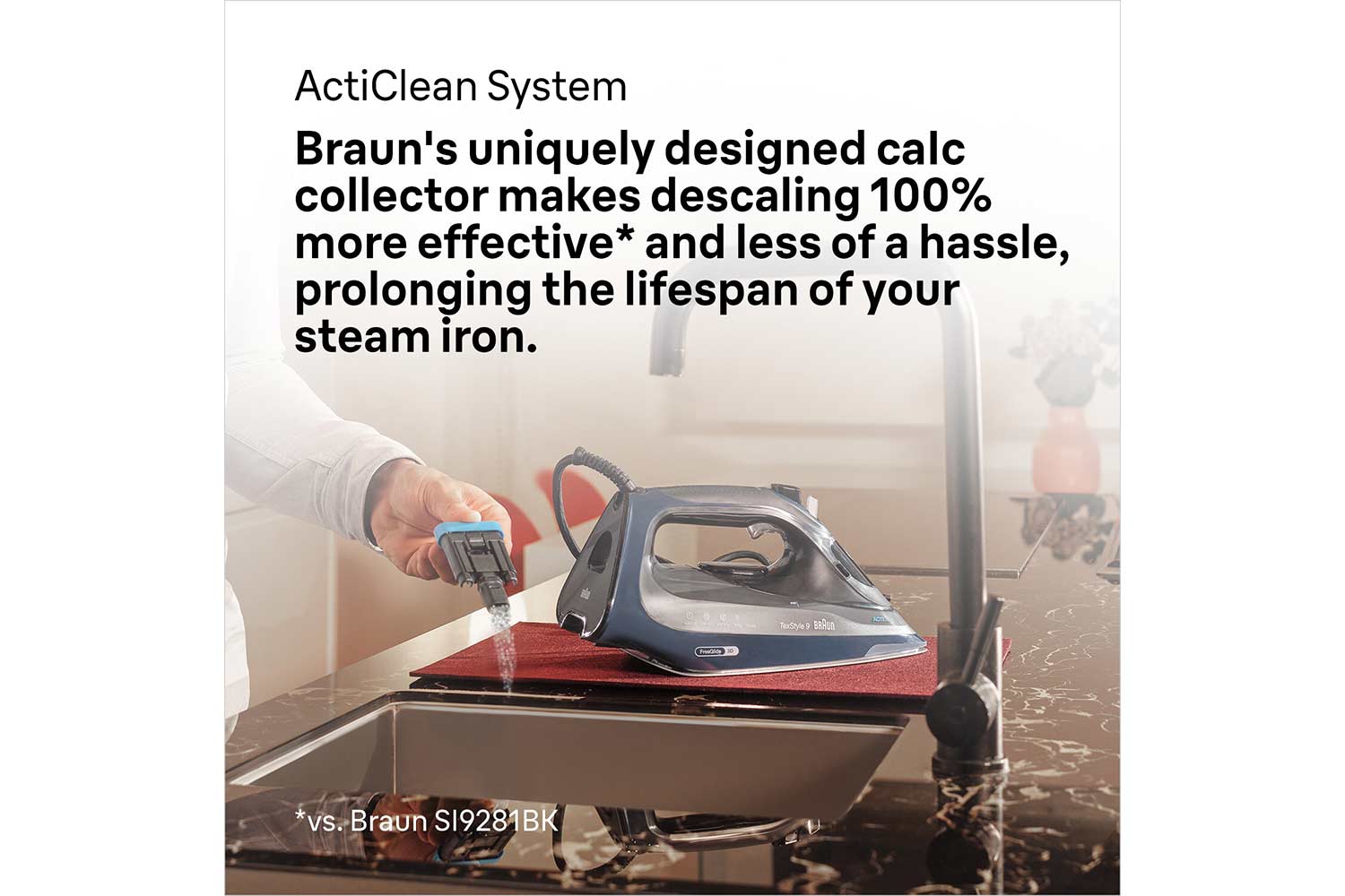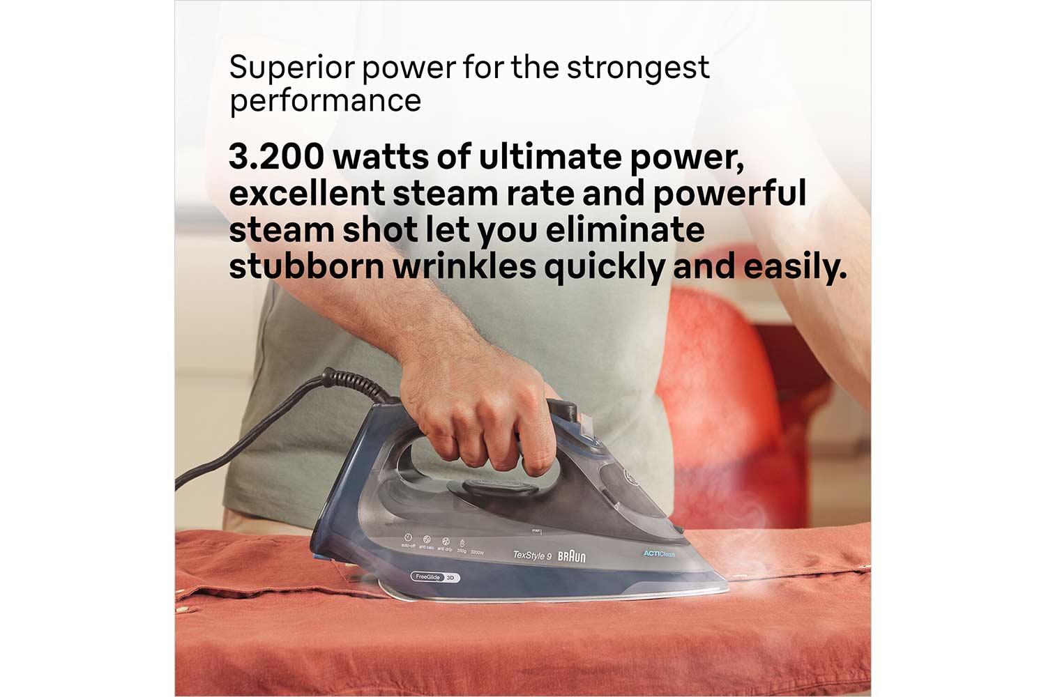 The TexStyle 9 is Braun's most powerful steam iron which features 3200 watts of power and is equipped with the world's first FreeGlide 3D Technology. On top of that, it features the new ActiCIean System. This uniquely designed caIc collector makes descaling less of a hassle and 100% more effective*, prolonging the lifespan of your steam iron. TexStyle 9 also features iCare Technology, which protects your clothes with a safe temperature for all kinds of fabrics — for smart textile protection.