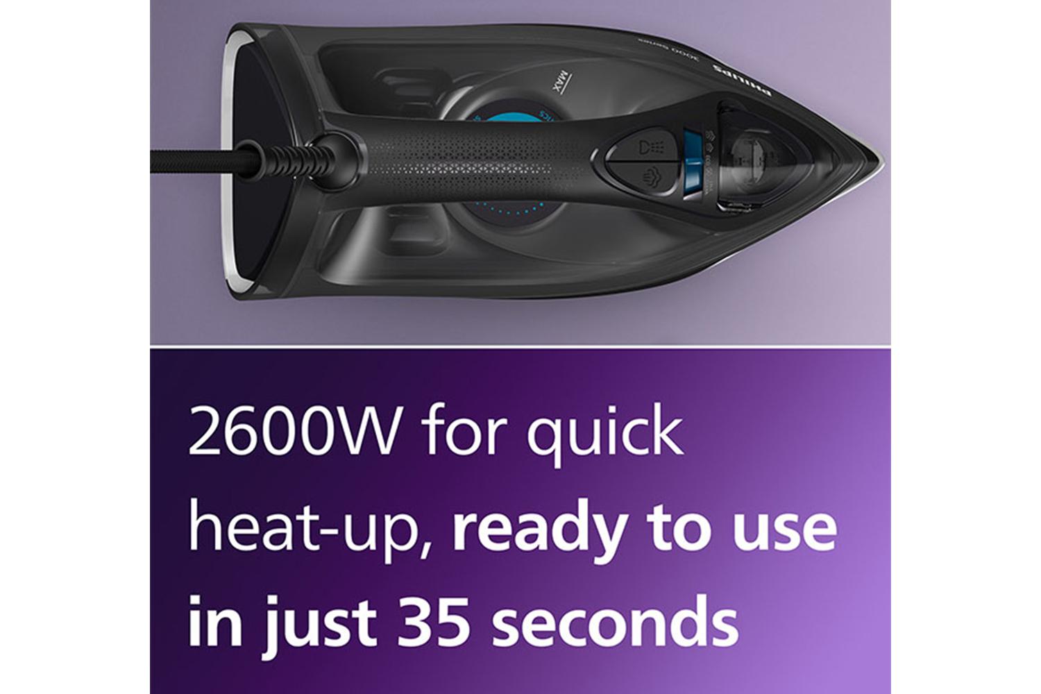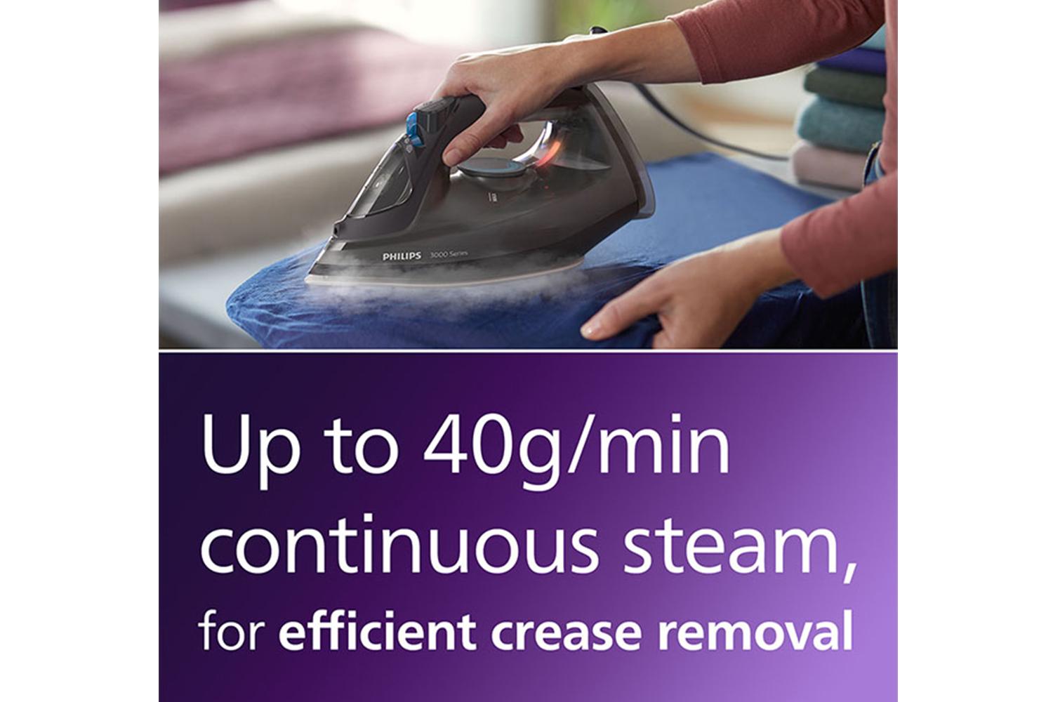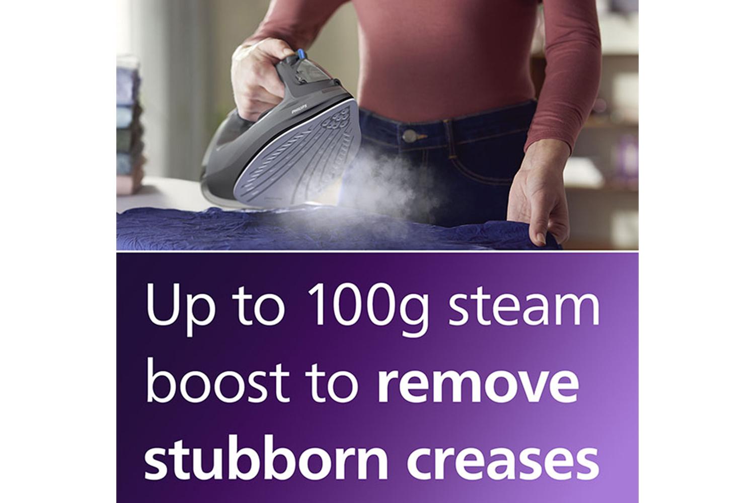 Experience elevated ironing performance with a powerful 2600 W operation that delivers fast warm-up and robust performance. It also employs a continuous steam output of up to 40g/min, ensuring consistent and even ironing results all through. Not leaving out the robust Steam Boost option, capable of delivering up to 200g of extra power to penetrate deeply into fabrics. This ultimate elixir removes the toughest creases within moments, ensuring you crisp finishing every time.