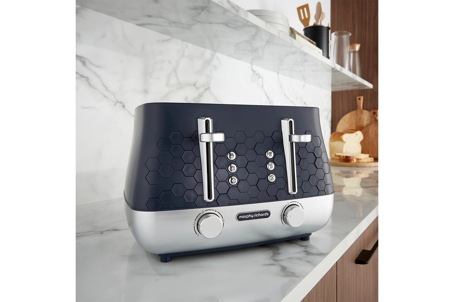 If you’re looking for a new toaster, look no further than the Morphy Richards Cassini 4-Slice Toaster! The Cassini range features a distinctive hexagonal design across the kettle, toaster, and microwave, creating a cohesive and modern aesthetic for your kitchen. Combining premium quality with a modern design, Morphy Richards Cassini toaster is crafted with multiple features to ensure a user-friendly design, this high end electric toaster will certainly make busy morning breakfast routines much easier. For instance, the high lift function allows easy and safe removal of smaller slices while the variable browning control lets you customise each slice to your ideal crispness. Not to mention, effortlessly keep your worktops clean with the convenient removable crumb tray while the illuminated control buttons offer a sleek, modern touch.