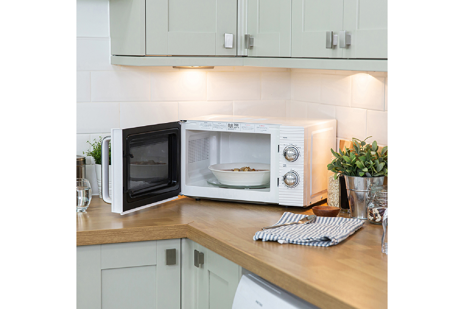 To use the microwave, simply select a power level and the cooking time required by turning the dials. The internal microwave light lets you know that cooking is in progress. When the cooking cycle has finished the microwave has a handy ringer function that will sound to alert you. And that’s it! Cooking has never been so easy.
