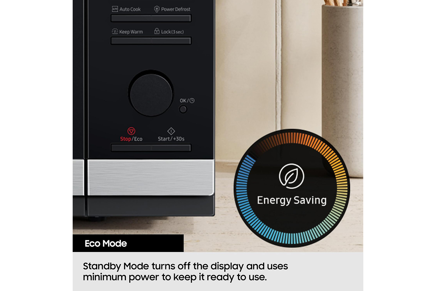 Home appliances that stay powered on every day waste energy without you noticing, The Standby Mode turns off the microwave oven’s display and uses the minimum power to keep it ready to use.