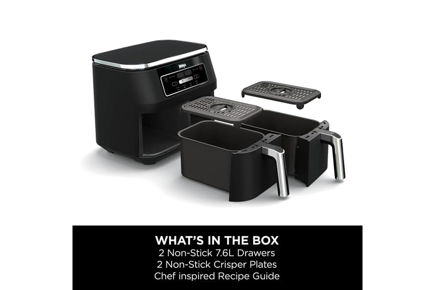 A simple digital control panel with a countdown timer makes it easy to program each drawer and see how much cooking time is left. Independent cyclonic fans and rapid heaters let you individually control each zone’s settings. Get started straight away with a Chef-inspired Recipe Guide in the box, packed with Ninja Air Fryer recipes and cooking charts.