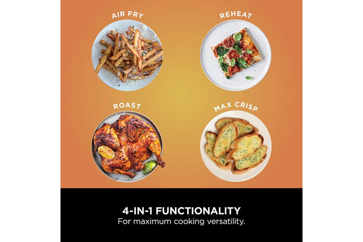 - Pre-set Functions: Max crisp, Air fry, Roast, Reheat