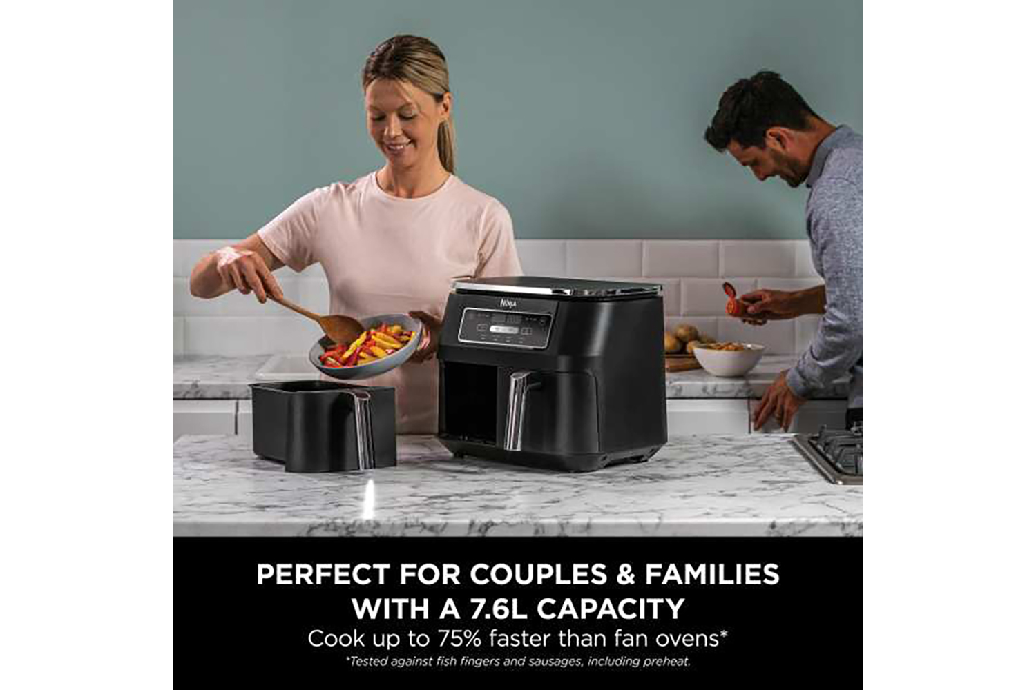 Different foods, different times, different programs – both ready at the same time! With 2 separate cooking drawers, you can SYNC or MATCH cooking programs and times for total versatility. The large 7.6L capacity is perfect for couples or families, fitting up to 1kg of fries or a 1.6kg chicken into each drawer.