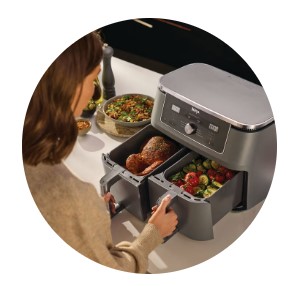 Dual zone cooking just got a brand new look. Meet the large capacity air fryer that cooks 2 foods, 2 ways, and finishes at the same time – now with an updated design and sleek, dark grey metallic trim.