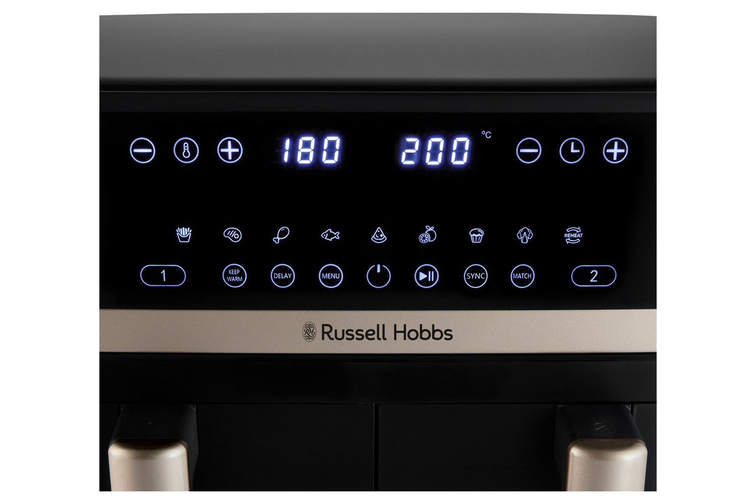 The Russell Hobbs Satisfry Dual Basket Air Fryer is ready to take your cooking up a notch. The 2 baskets, each with an ample 4.5l capacity, are housed in a stylish black and Champagne-accented surround that will look smart in any kitchen. The digital touch screen and temperature controls make operating the 2 cooking zones quick and easy. Sync both baskets and let the Satisfry air fryer ensure your chunky chips and succulent steak are ready at the same time. Or match the settings to cook the same dish in both baskets when one batch of tempura just isn’t enough. With 9 pre-set functions, dishwasher-safe parts and 2800W at your fingertips, mealtimes just got a whole lot smoother with this double basket air fryer.
