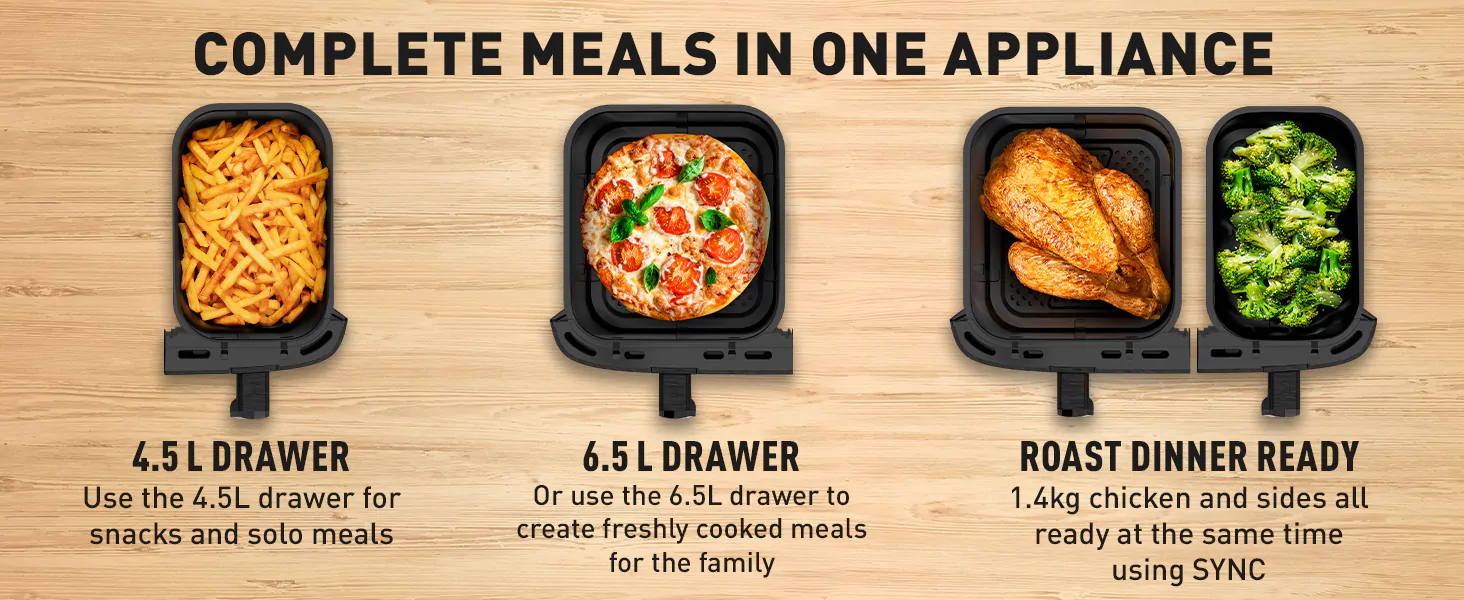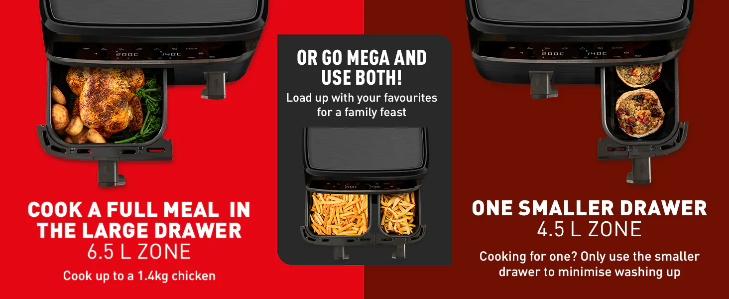 XXL capacity (11 L) with a 6.5 L drawer for big ingredients like a 2 kg Sunday roast, and a 4.5 L drawer for sides like 1 kg of French fries—ideal for 8 to 10 people.