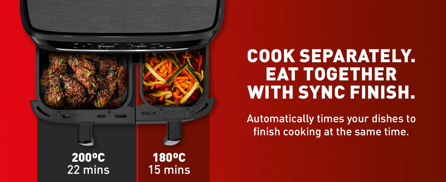 Cook two different food at once, for a complete family meal ready in one go thanks to this dual air fryer with synchronized cooking.