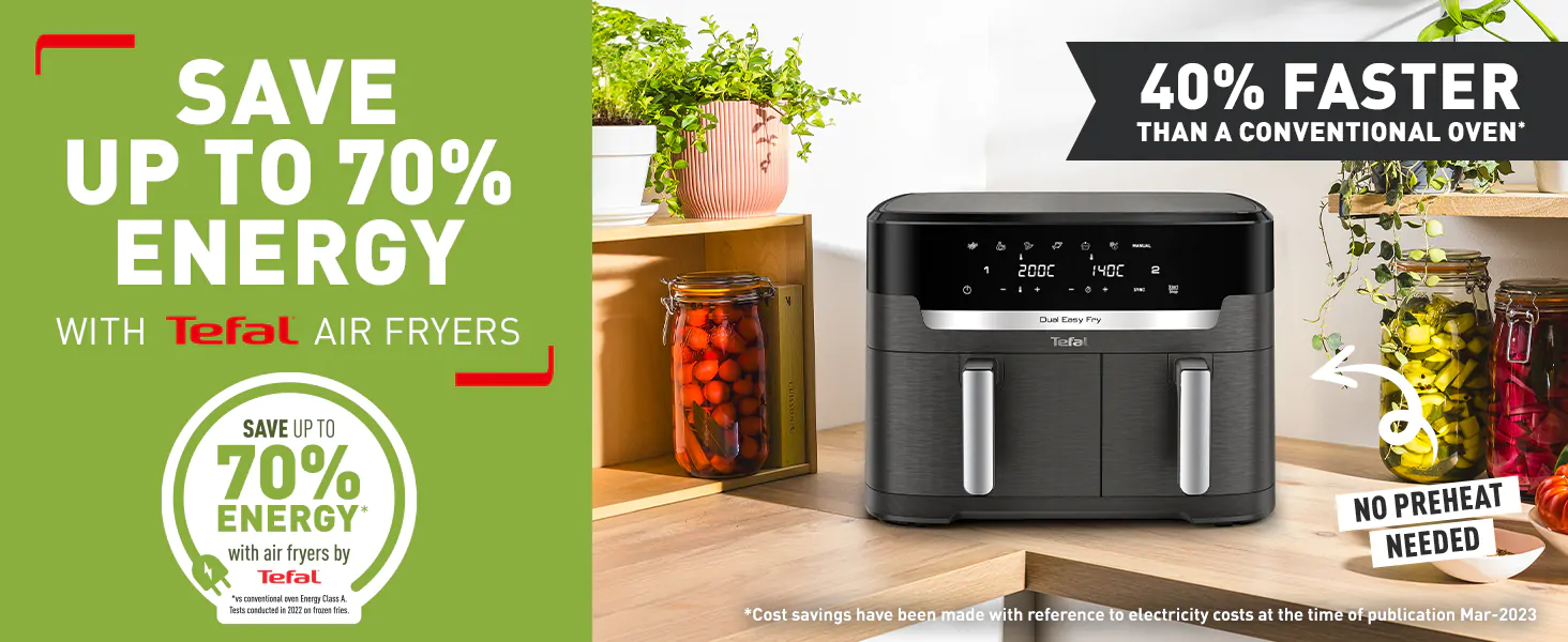 Discover a family-friendly dual air fryer that prepares a complete, generous meal in one go! From crispy fries to mouthwatering salmon, easily prepare a wide variety of balanced delicious meals: a large drawer holds big ingredients while a regular drawer is perfect for sides. Choose from 7 pre-set programs, including a manual setting, and consume up to 70% less energy* than a traditional oven. Cook up to 45% faster* than a traditional oven, too! With an 11 L capacity, Tefal's largest dual air fryer has the whole family covered. It's 6.5 L drawer is perfect for big ingredients like a 2 kg roast chicken, while the regular 4.5 L drawer cooks 1 kg of fries or a tray of 9 muffins with ease. Ideal for 8 to 10 people!