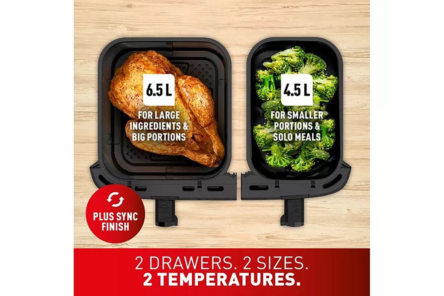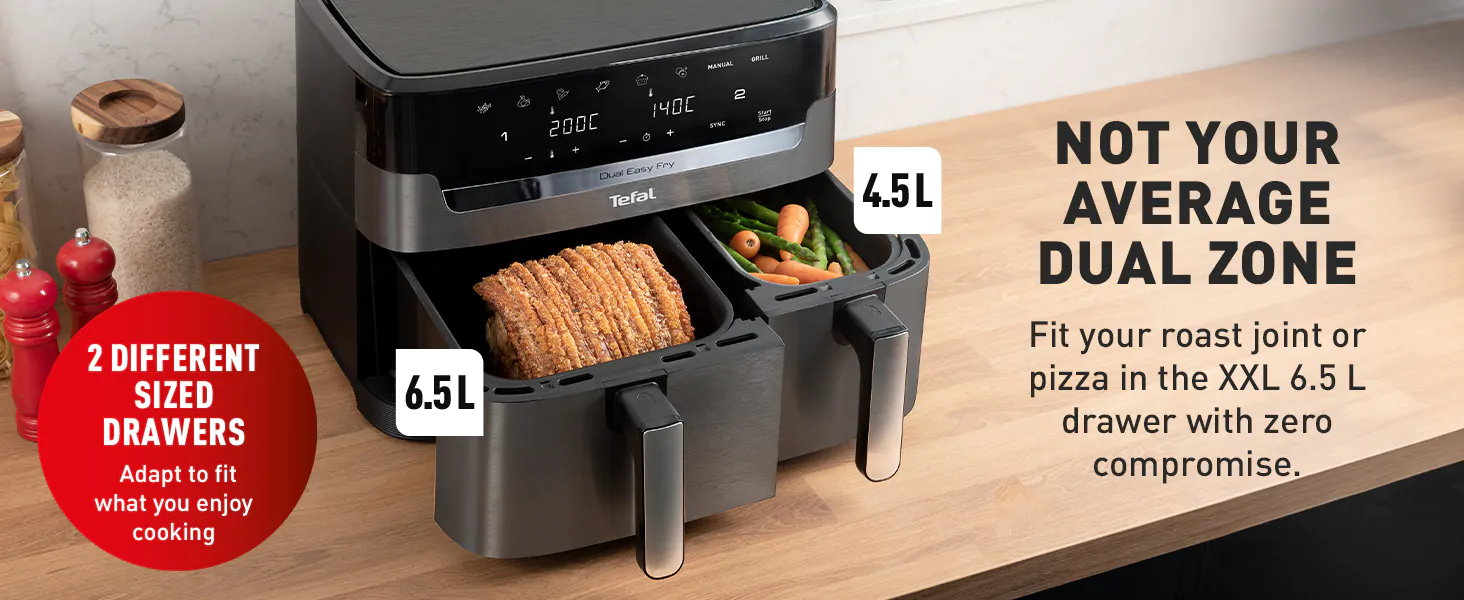 The largest dual air fryer by Tefal: XXL capacity with a 6.5 L drawer and a 4.5 L drawer—ideal for 8 to 10 people
