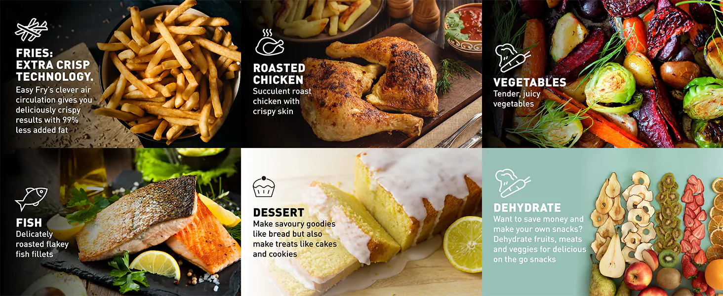 7 Pre-set programs: Fries, Chicken, Vegetables, Fish, Dessert, Dehydration and manual temperature control (40-200°C)