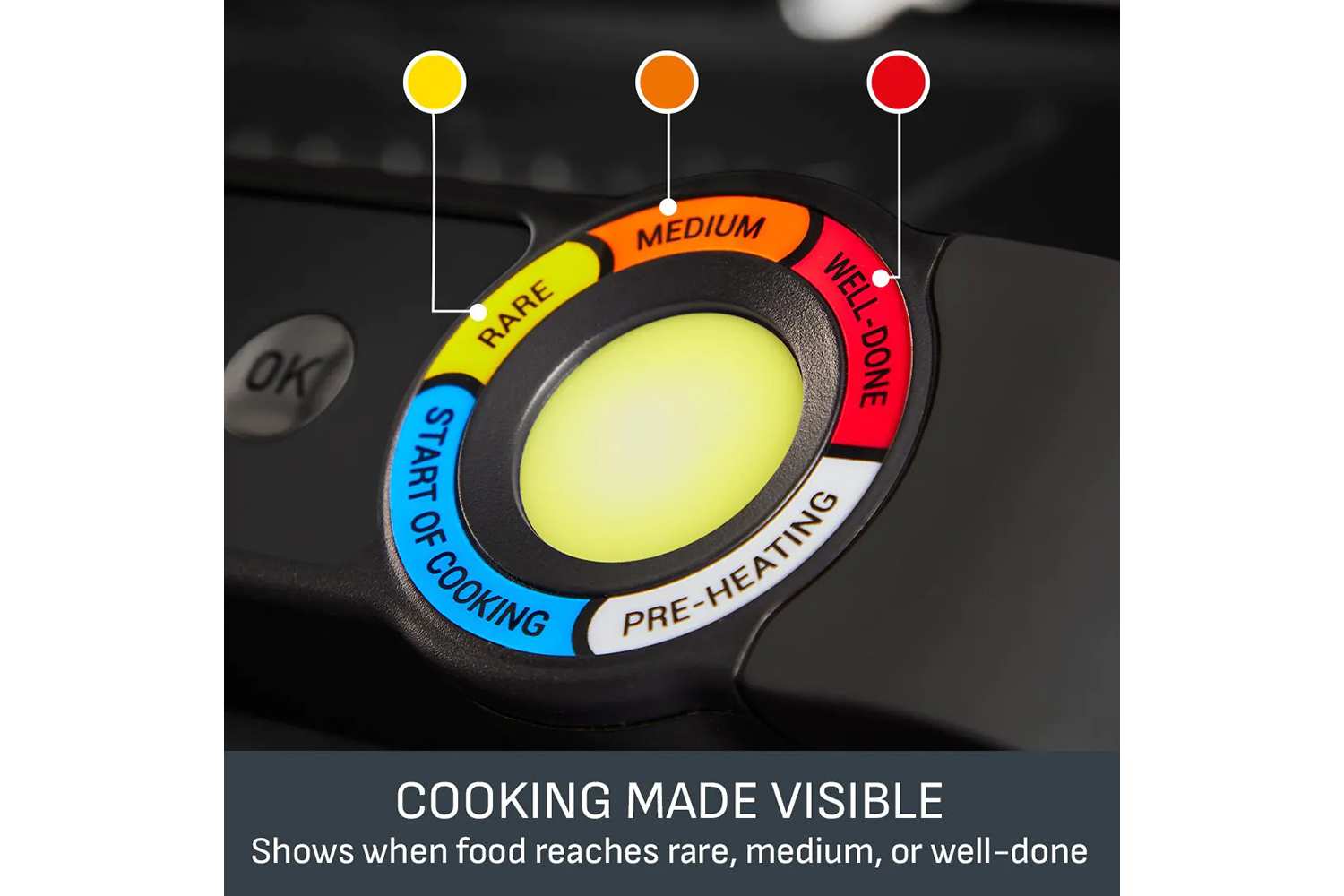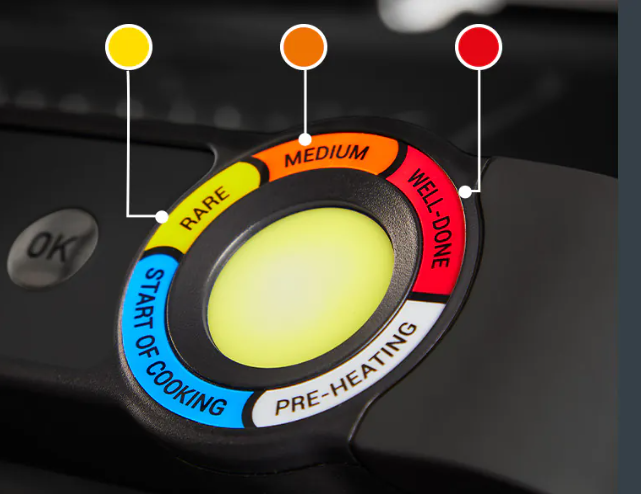 Colour-coded indicators show when food reaches rare, medium, or well-done.