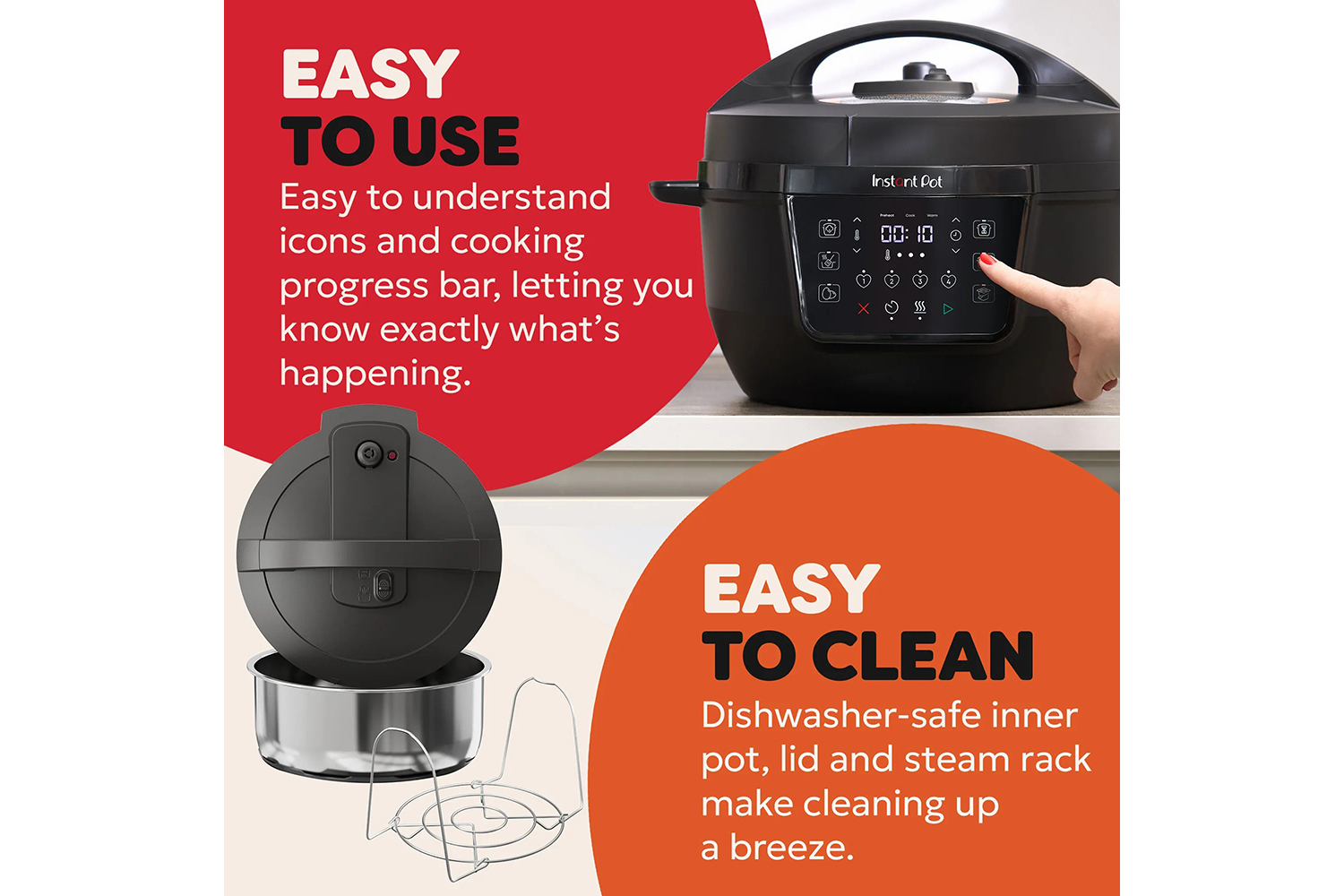 Dishwasher-safe BPA/PFOA/PTFE-free stainless steel inner pot, lid and accessories for stress free clean up.