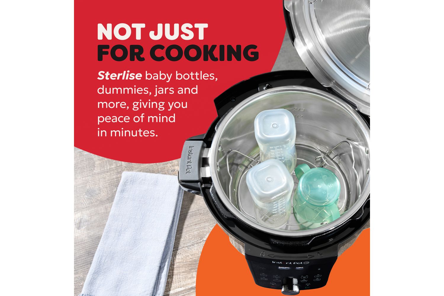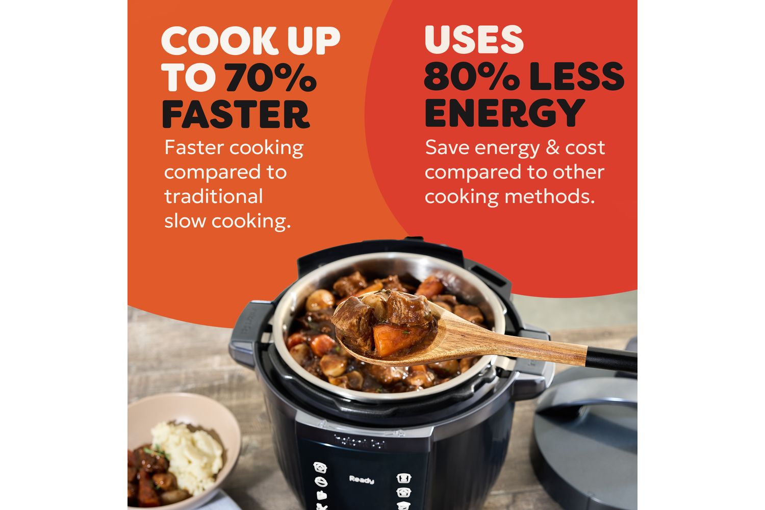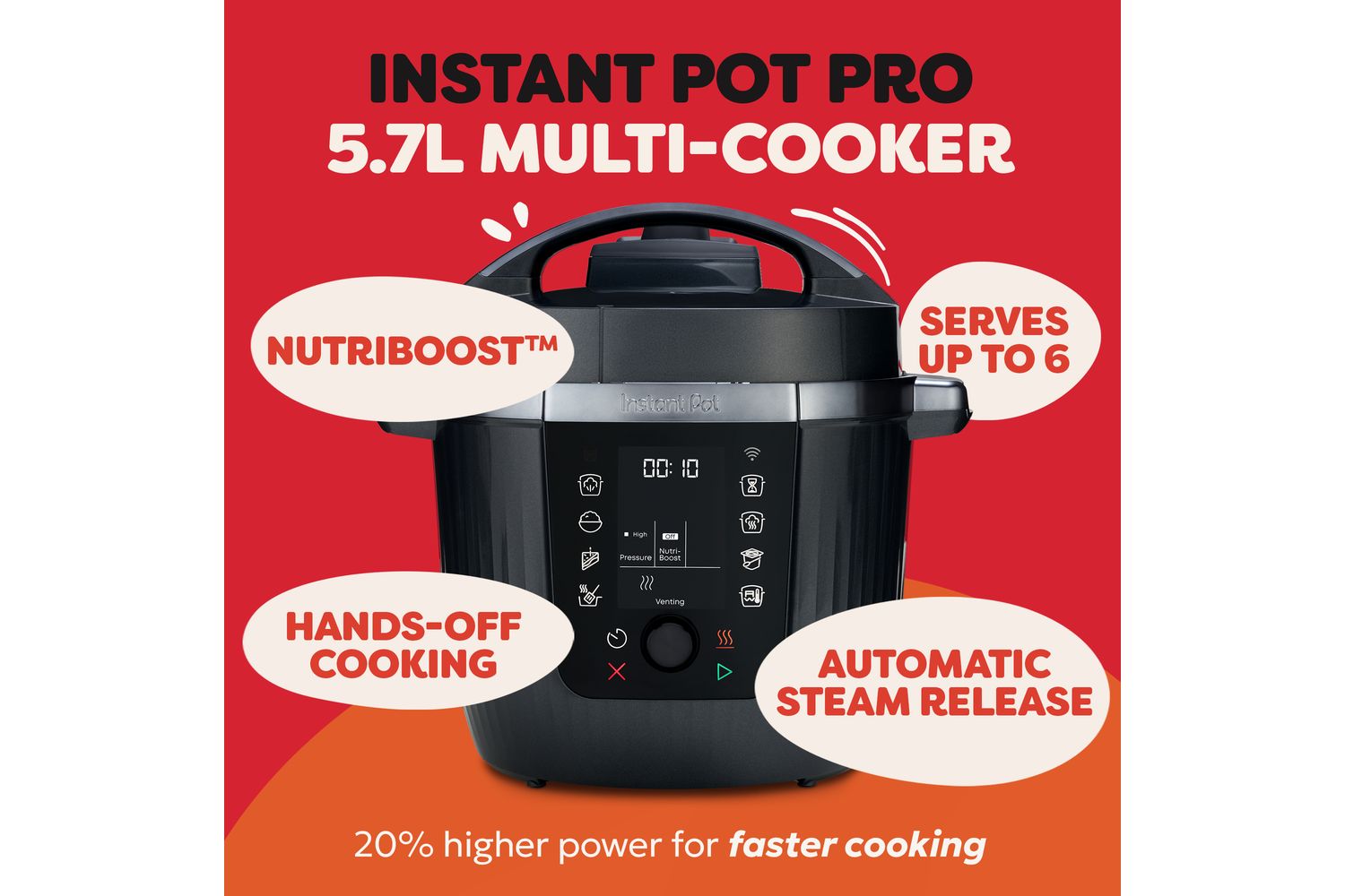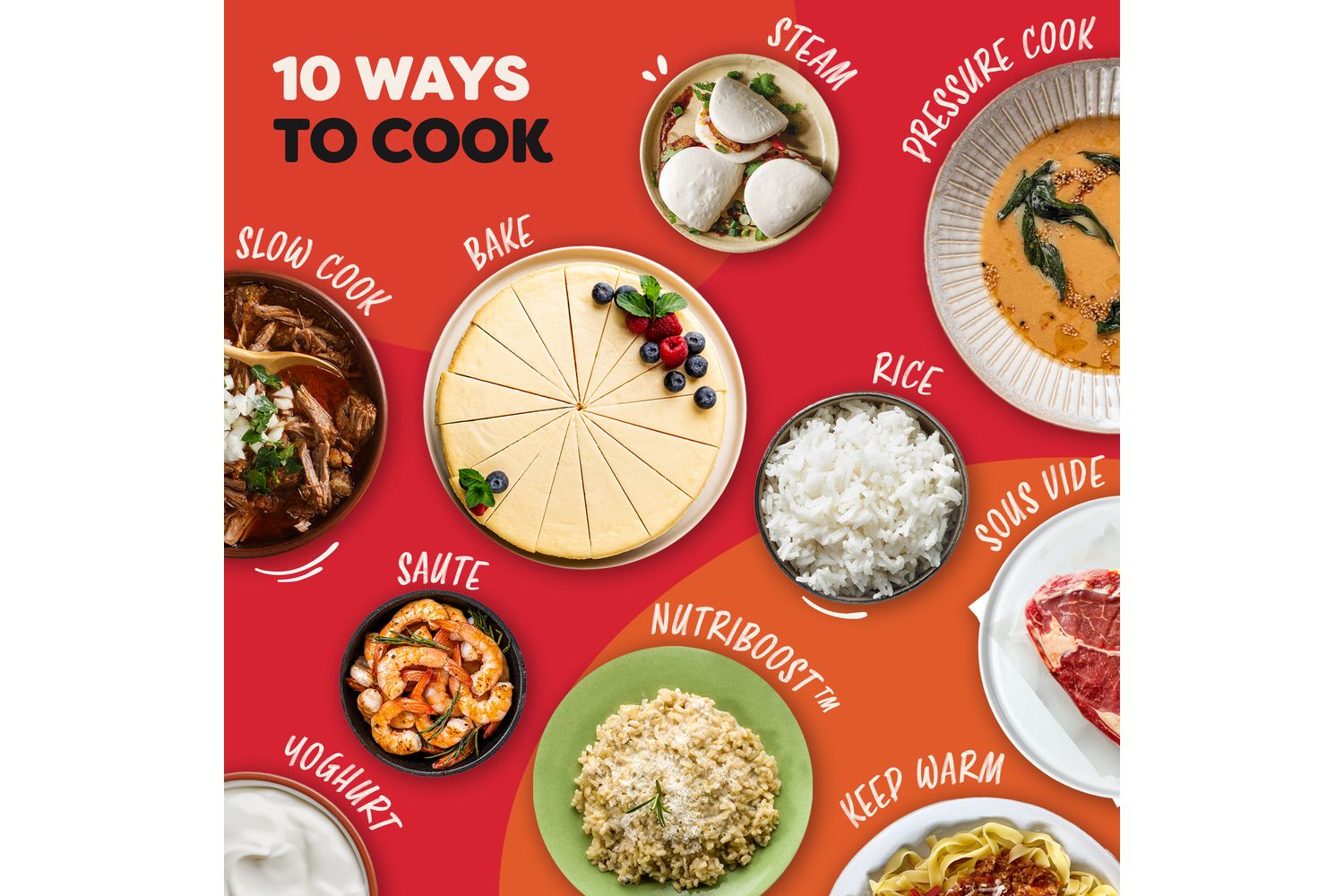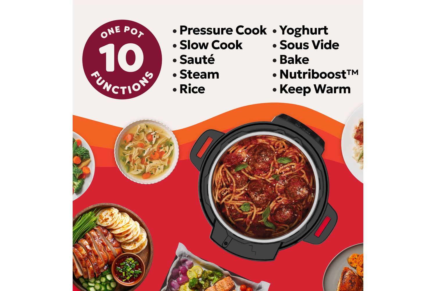 10 functions in one; pressure cook, slow cook, sauté, rice, steam, sous vide, bake, yoghurt, keep warm and Nutriboost.