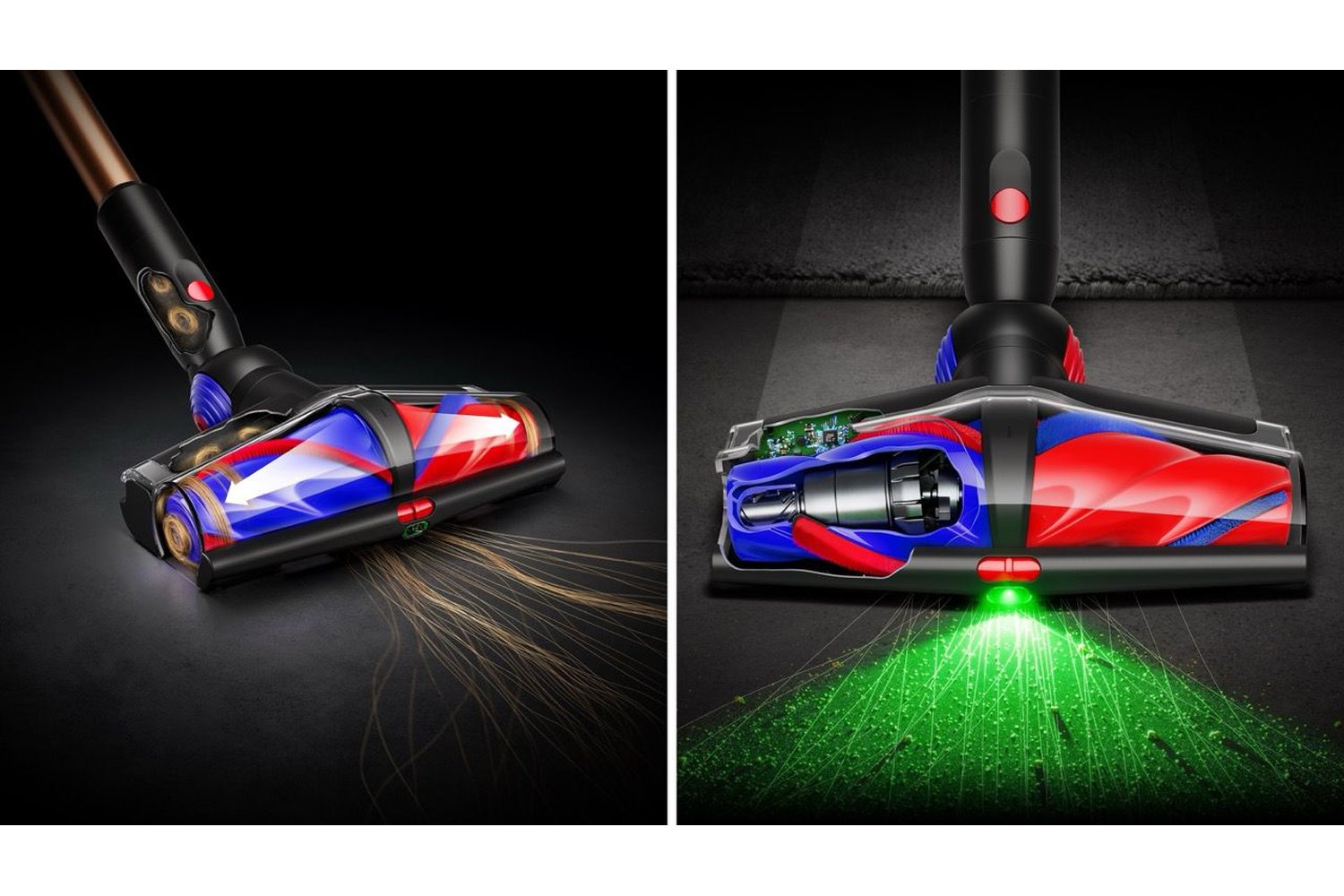A field of illumination is projected at 90° and automatically turns on when cleaning hard floors- to reveal microscopic dust you can’t normally see.