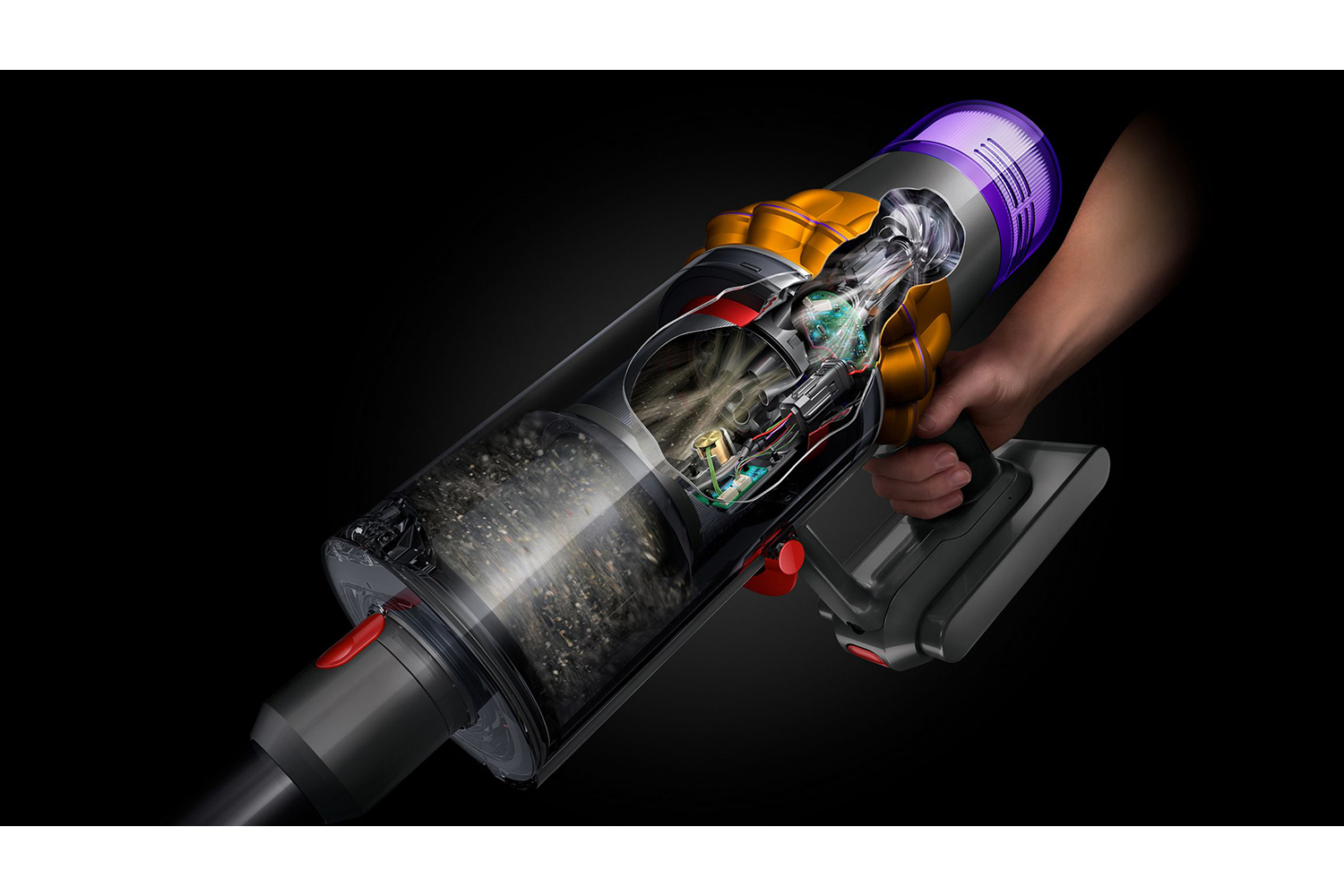 Dyson’s pioneering 14 cyclones capture and separate dust and debris, so there’s no loss of suction.