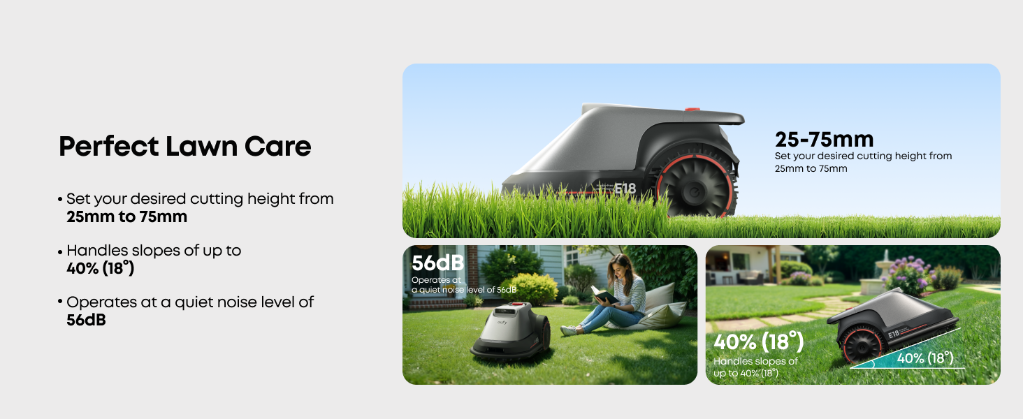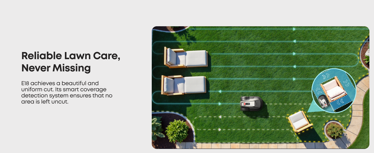 E18 can achieve beautiful and uniform parallel cutting. Smart coverage detection system ensures no area is left uncut. E18 can cover a maximum of 1200 m² (0.3 Acre).