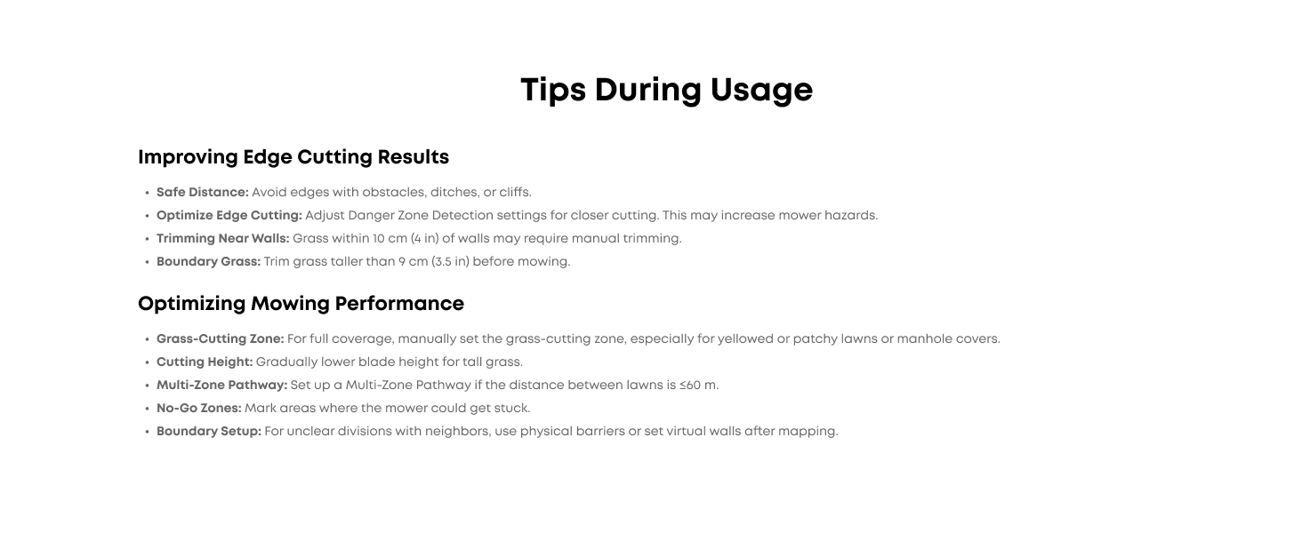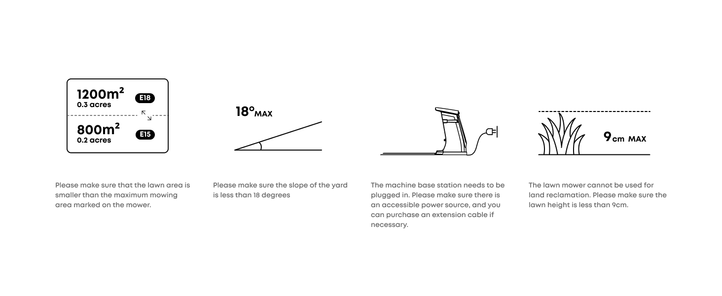 - Recommended mowing size: 1200 m² (0.3 Acre)