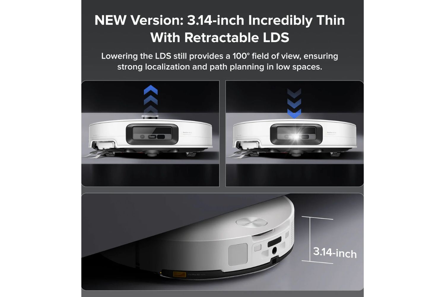 and raises it again in open areas, enabling the slimmest Roborock design yet at just 7.98cm.