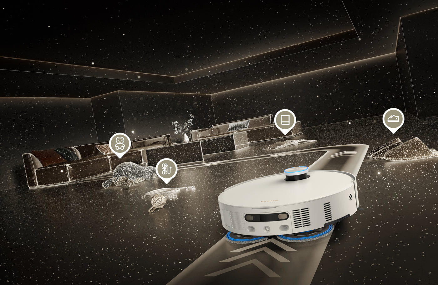 Matrix10 Ultra seamlessly finds its way through various furniture shapes, steep terrain, and tricky spaces, ensuring any mess in its path is fully dealt with—all in real time.