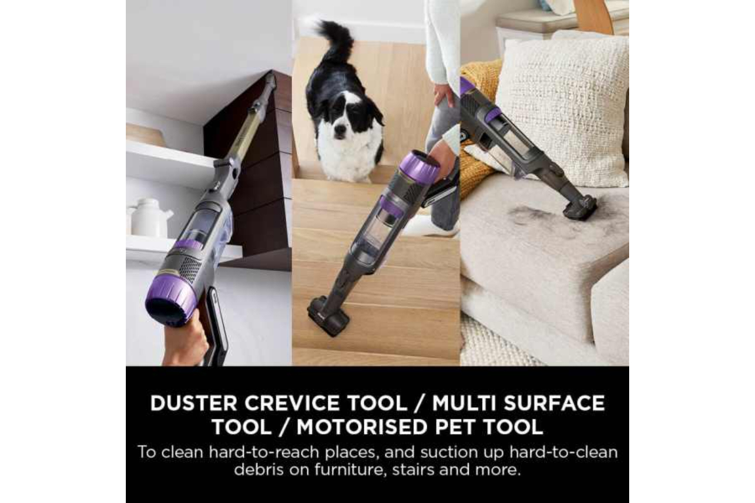 Shark PowerDetect Technology isn’t just focused on your floors. By cleverly converting to a handheld vacuum, it’s perfect for cleaning stairs and furnishings. Complete with a Duster Crevice tool, Multi-Surface Tool, and Motorised Pet Tool, you can deep clean the whole house – top to bottom.